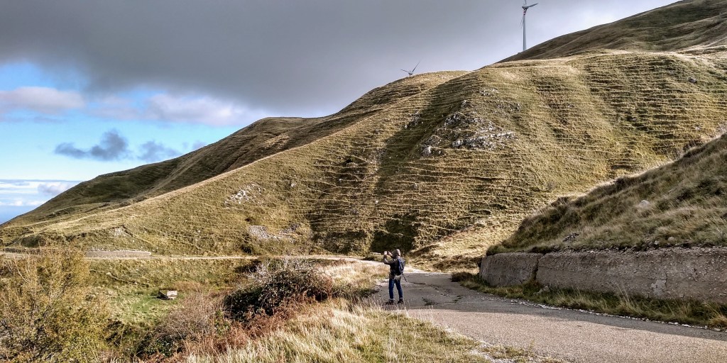 We continued on the ridge road, stopping frequently for the views. This was a great day to see the distant Tremiti Islands and the Gargano Peninsula from our perch. The wind had picked up by now and threatening clouds moved in, but it never deterred us. The noise level was elevated by the turbines and it presented a slightly unnerving atmosphere. I think I was just overwhelmed by the height and power of these sentinels.