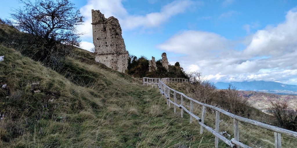 We continued our trek to the end of the gravel maintenance road to a grassy trail that led us to the ancient castle at Rocca Vecchia. Here, we took a short break to enjoy the beautiful old castle and the expansive views to Roccaspinelveti below and the Adriatic Sea on the horizen. We finished our hike heading down the trail to return to our car.