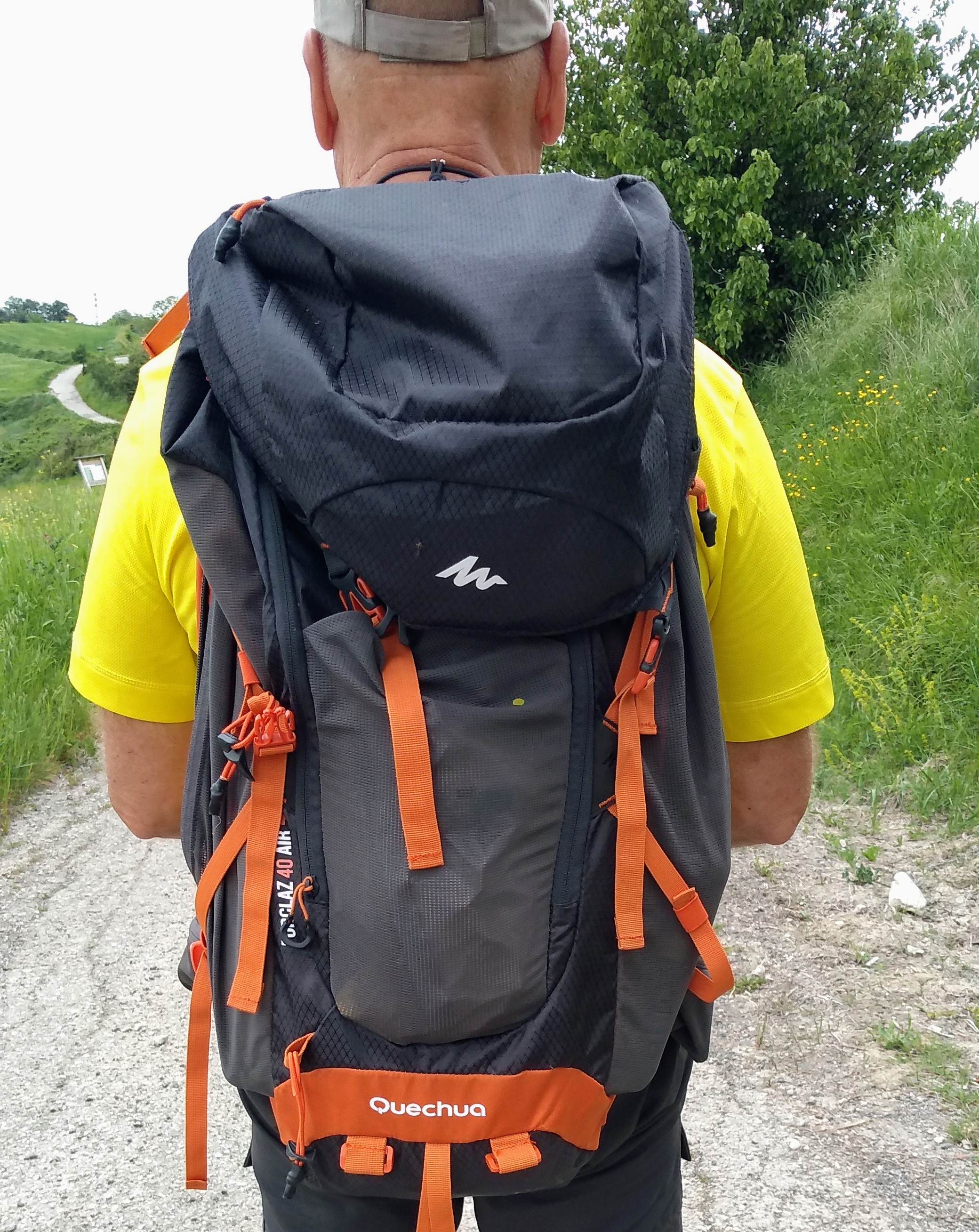 In regards to backpacks, we are all going with ultralight ones. It’s important, when walking a cammino with your week’s worth of clothes, etc. on your back, that you keep the weight to a minimum. The gauge is that your pack, with all your stuff apart from food and water, should be about 10% of your body weight. This is so very different from years ago, when backpackers would go out with huge packs containing way too much heavy gear. Times and technology have given us the freedom to go light and I’m loving it. I nailed the 10% after packing and repacking but also I got a bit OC. A number of ultralight hikers do a spreadsheet with everything broken down in grams to lbs and I just love spreadsheets! My categories are Pack (and bag/tent if I was carrying those), Clothes Worn, Clothes Packed, Consumables (Water & Food), Misc, Toiletries, Electronics, Personal ID/cards/cash. John and Alex just go by end weight and shake their heads at me, but I reveled in it! The image below is one page of 4 of my spreadsheet. Weights are in grams per line item and at the very top of the image you can see my weights converted from grams to pounds.