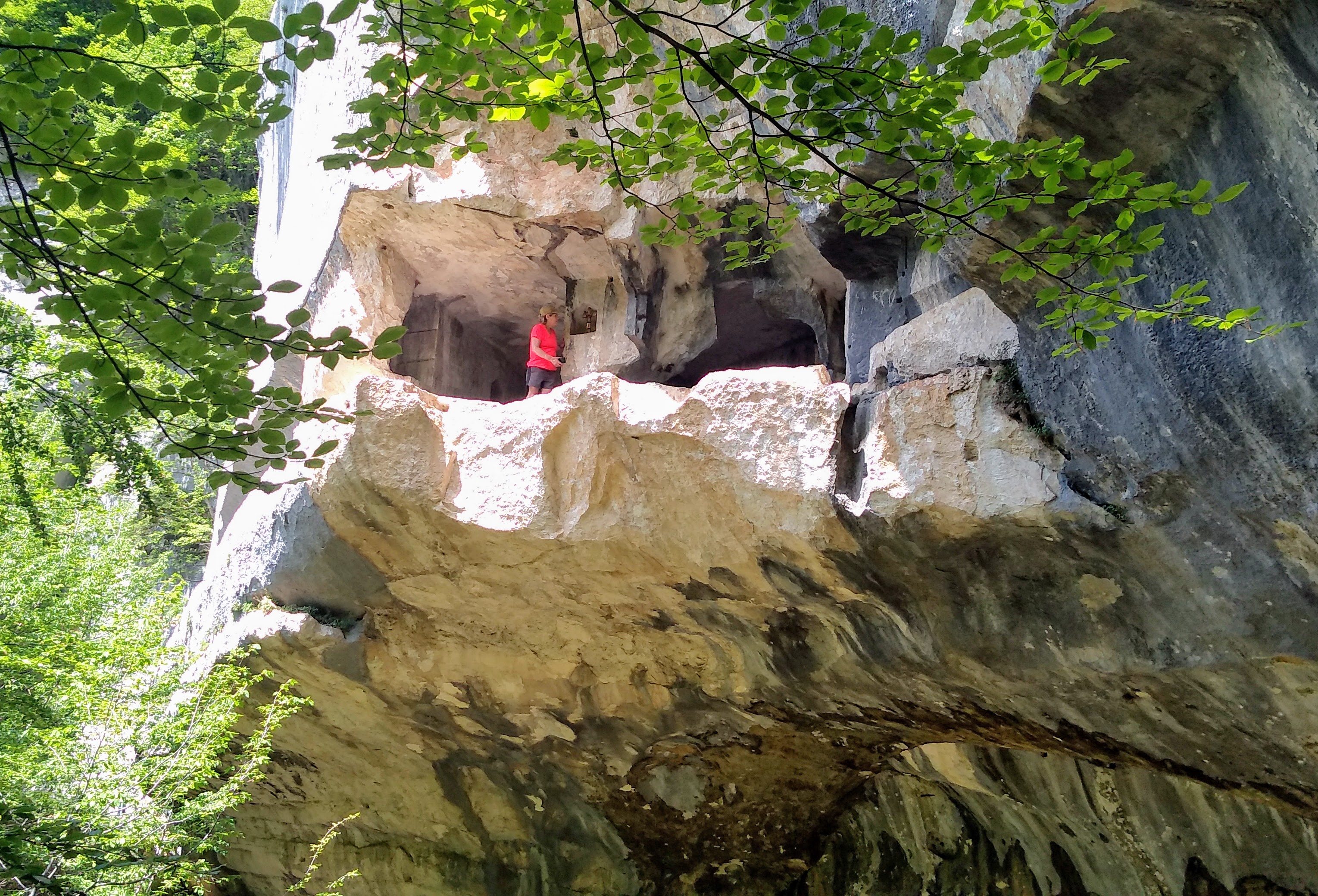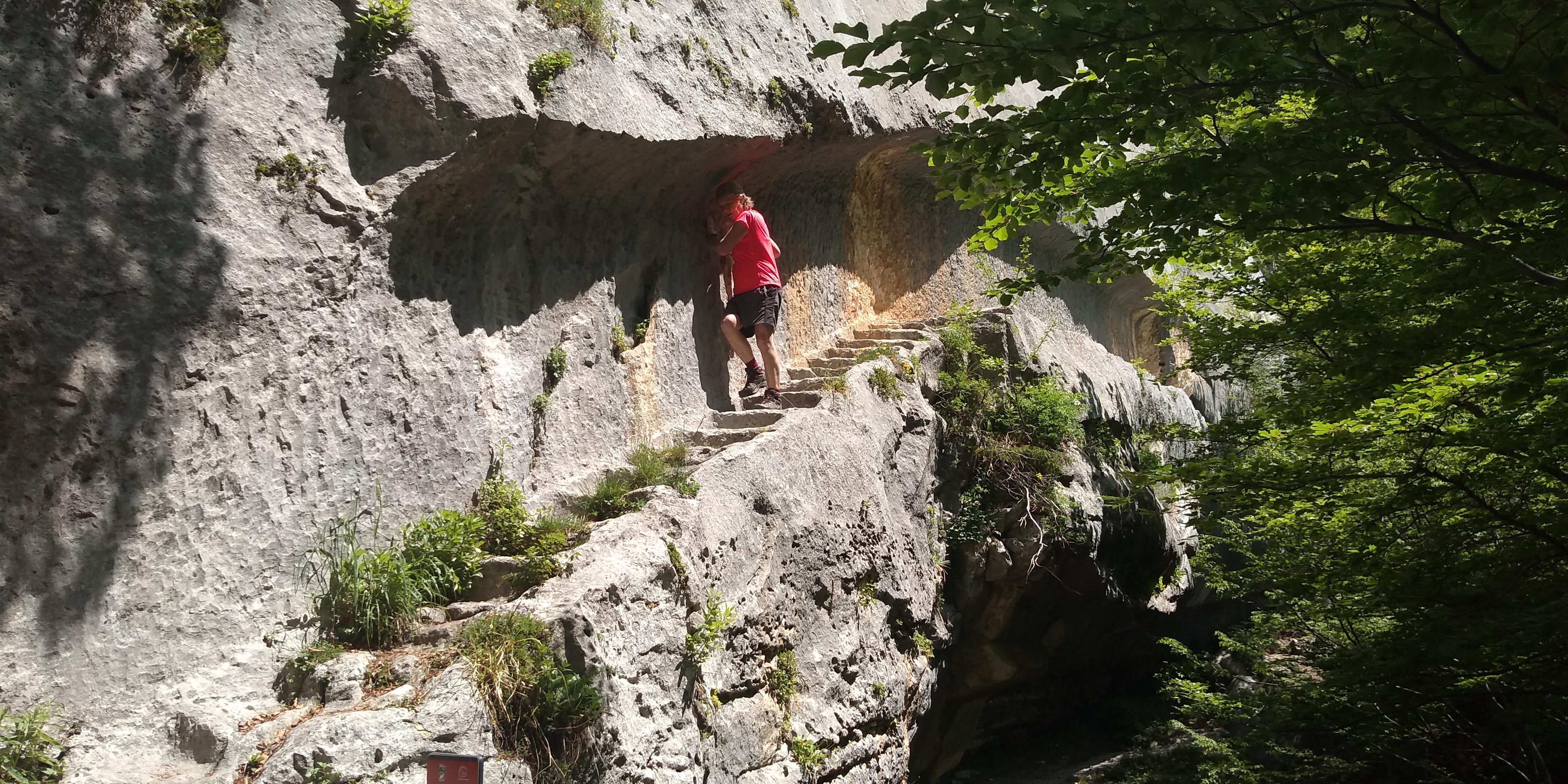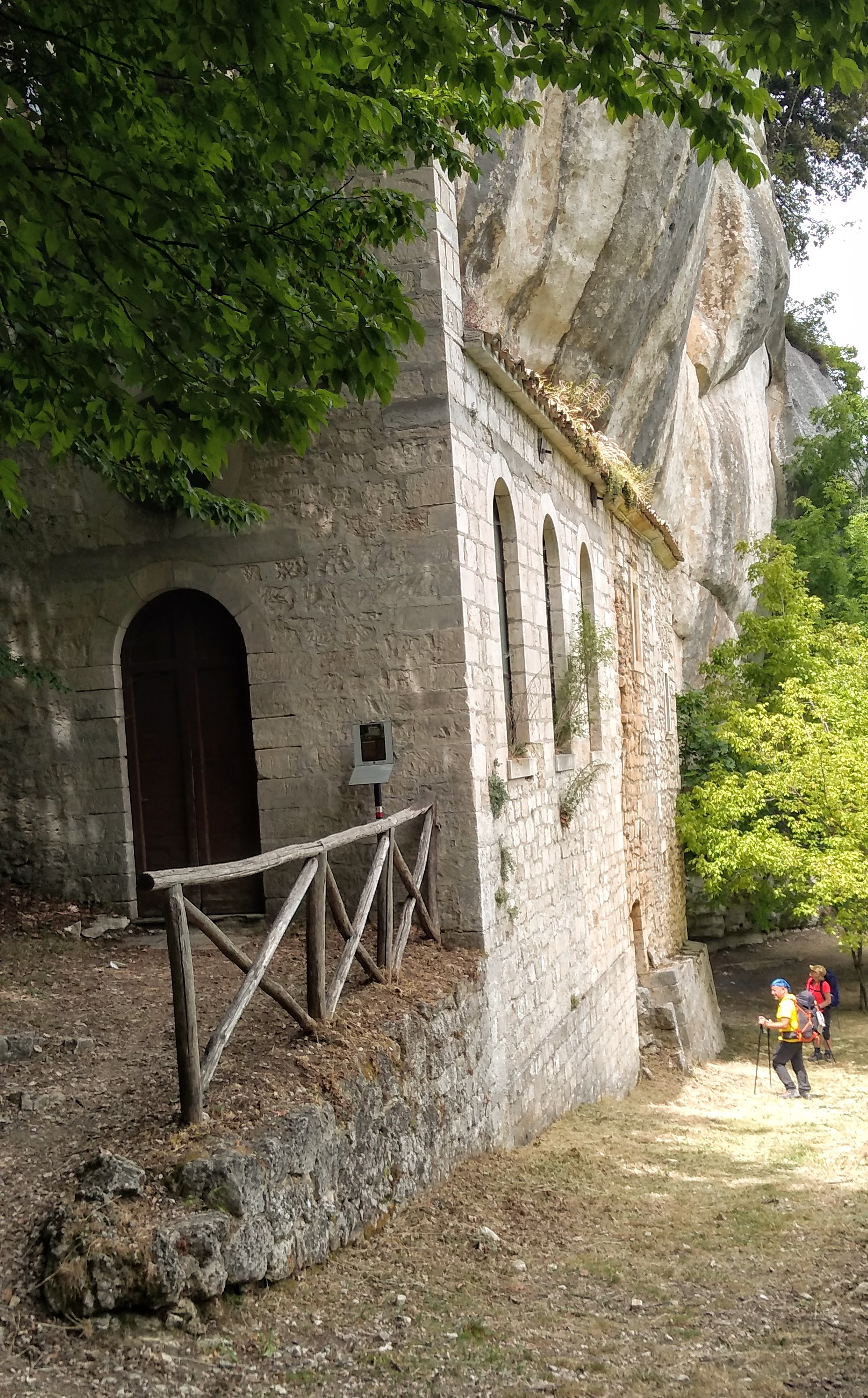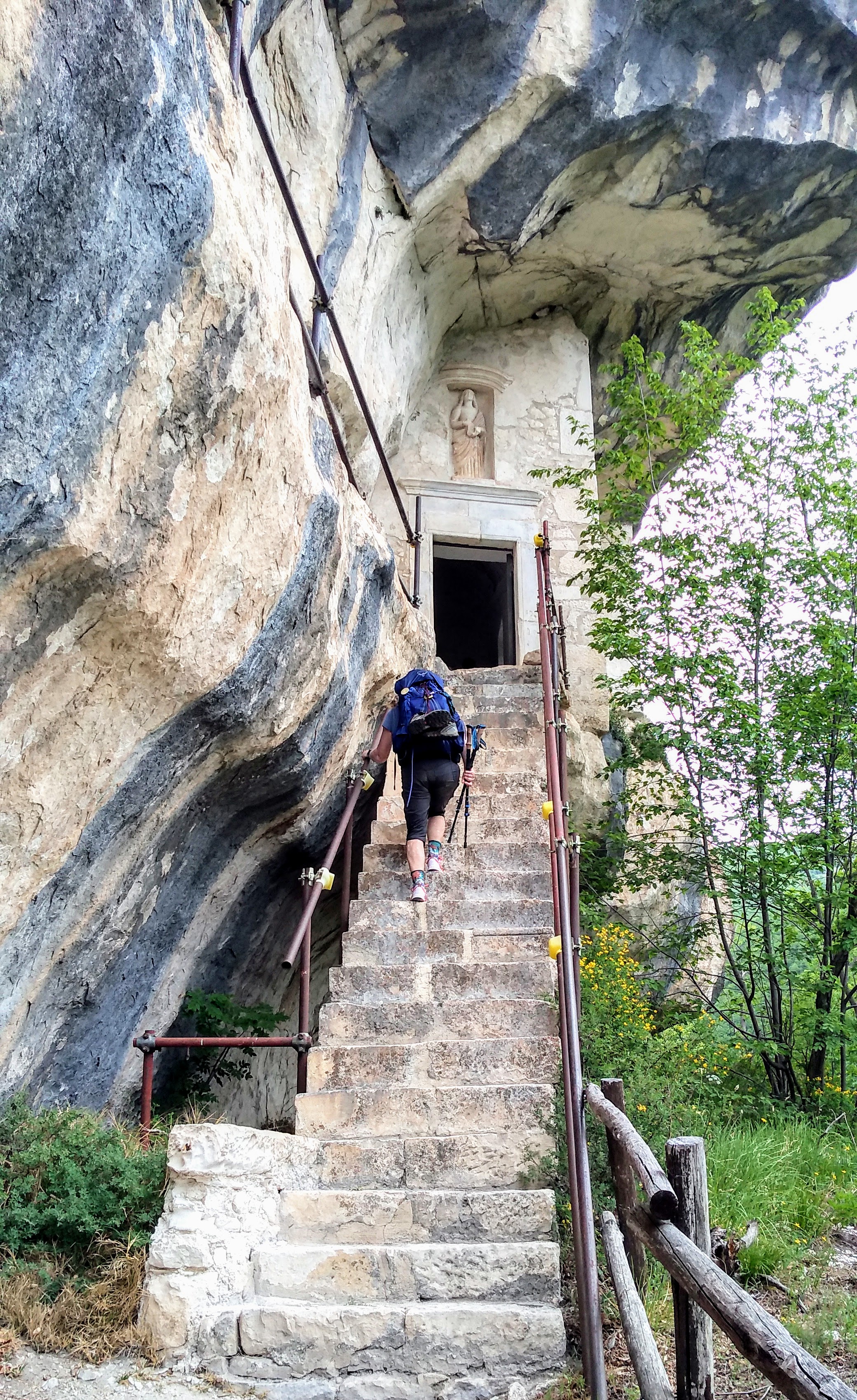 … an exposed passage on an overhanging ledge and a staircase carved onto the rock which, even being the both really short, must be considered as EE difficulty passages (Expert Hikers). The entrance into the hermitage of San Giovanni is via a staircase and then through a narrow horizontal ledge that in the final part must be done belly on the ground. The stretch, sited several meters above the ground and about 40 cm wide ( 16 inches), is not protected, therefore, the entrance is only recommended to people who are adequately equipped and trained.
