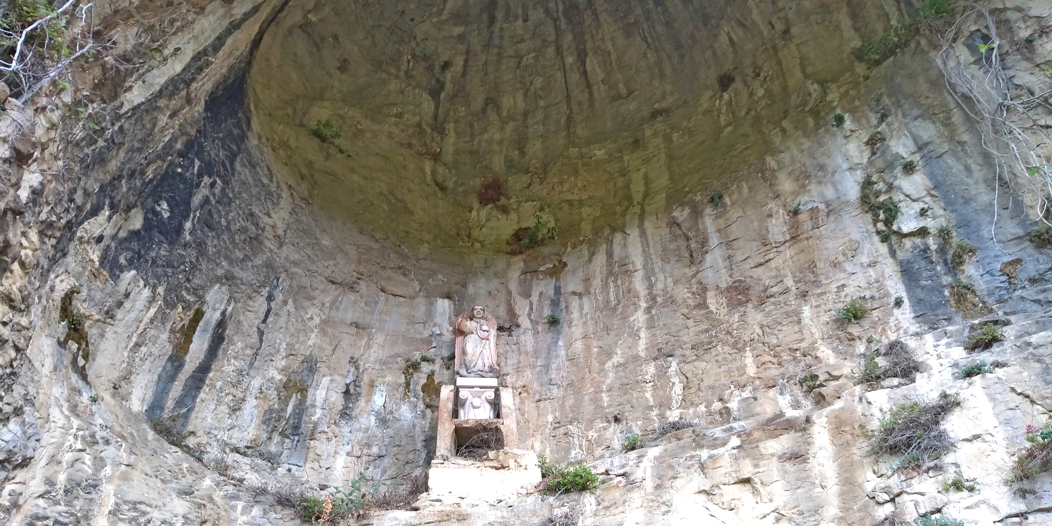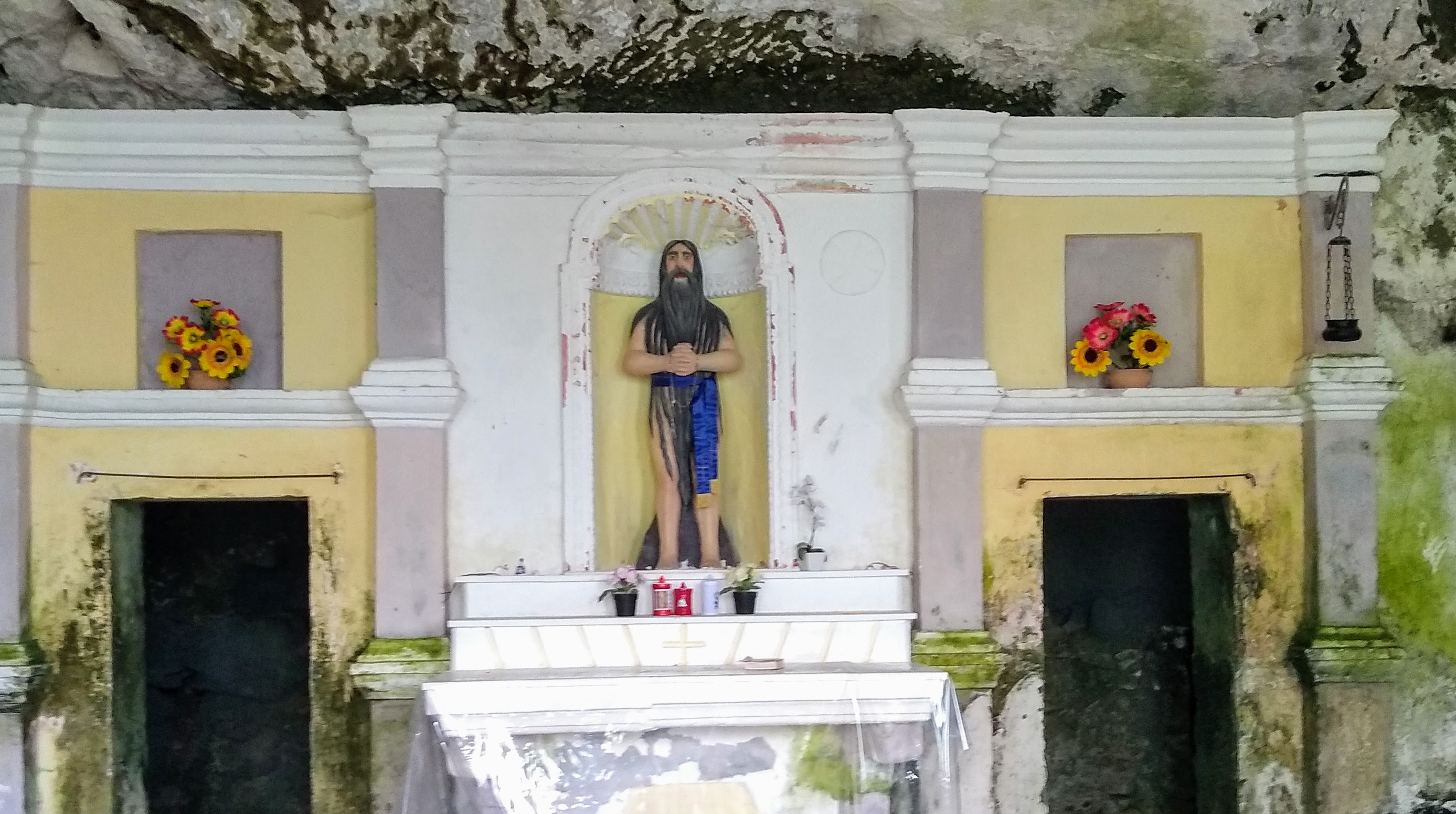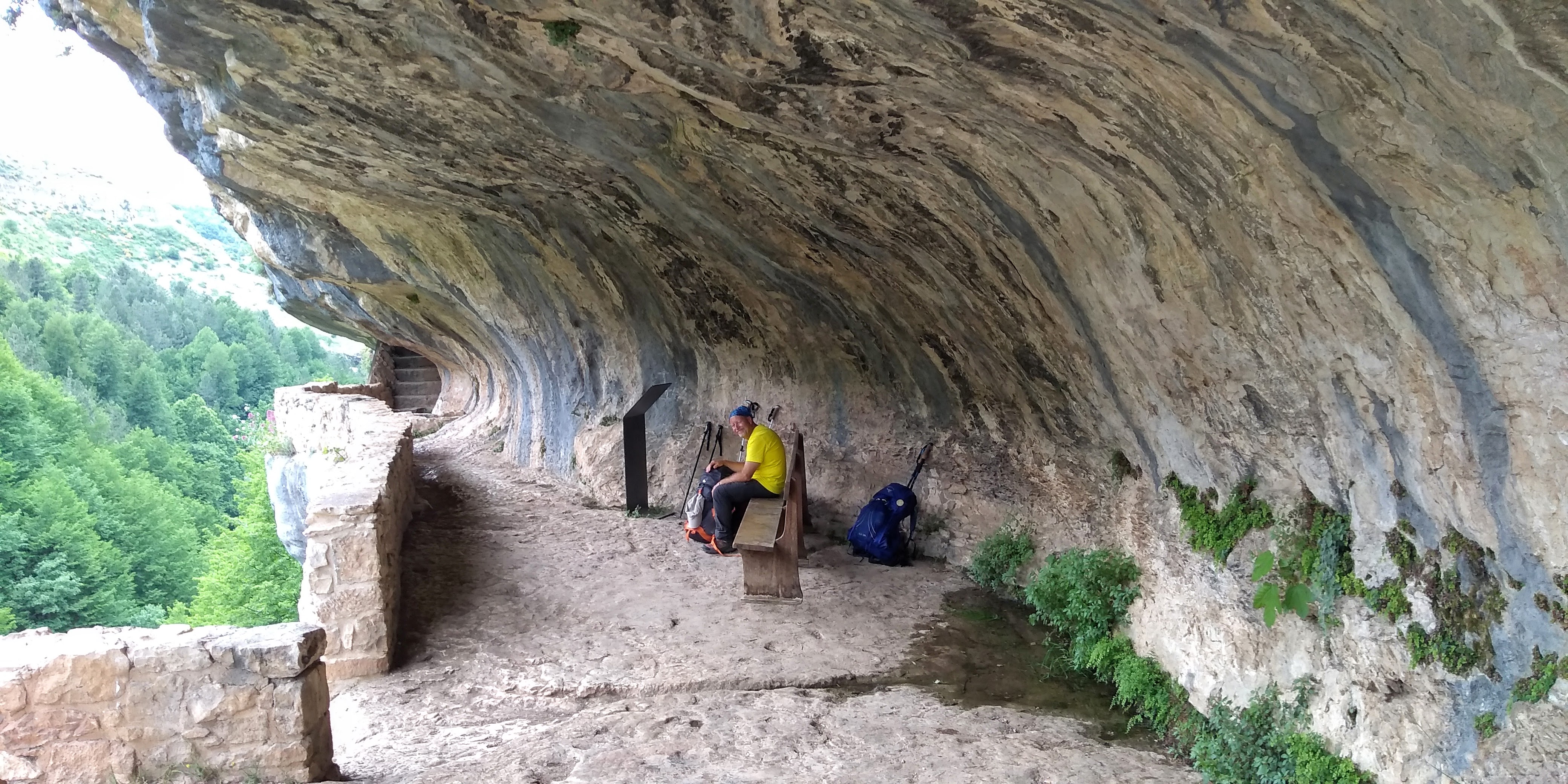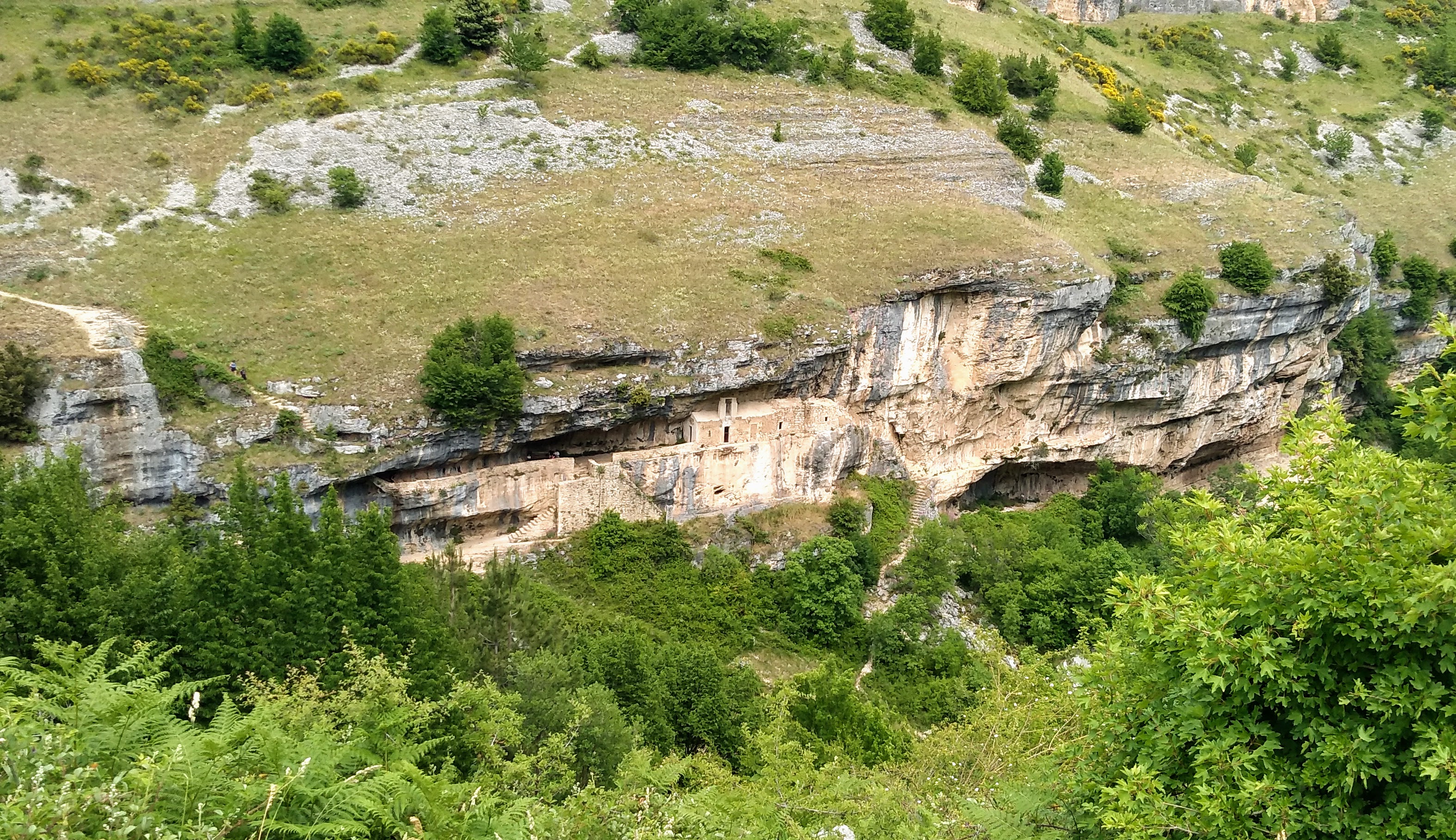 … an exposed passage on an overhanging ledge and a staircase carved onto the rock which, even being the both really short, must be considered as EE difficulty passages (Expert Hikers). The entrance into the hermitage of San Giovanni is via a staircase and then through a narrow horizontal ledge that in the final part must be done belly on the ground. The stretch, sited several meters above the ground and about 40 cm wide ( 16 inches), is not protected, therefore, the entrance is only recommended to people who are adequately equipped and trained.