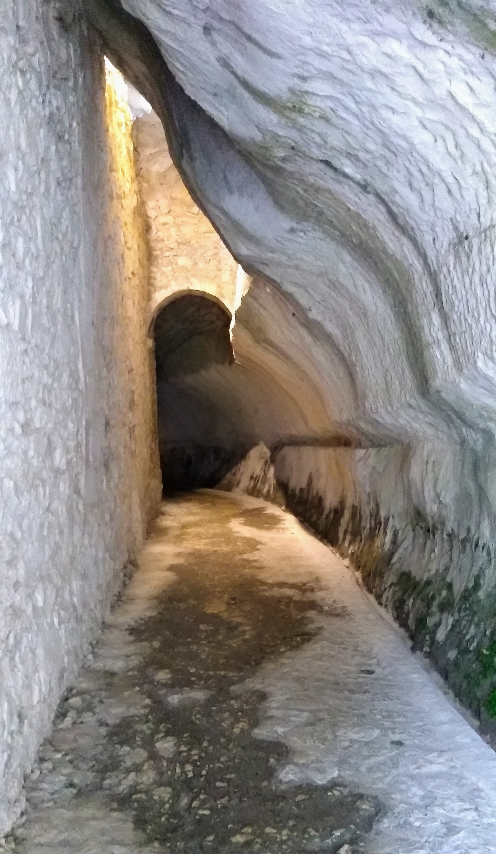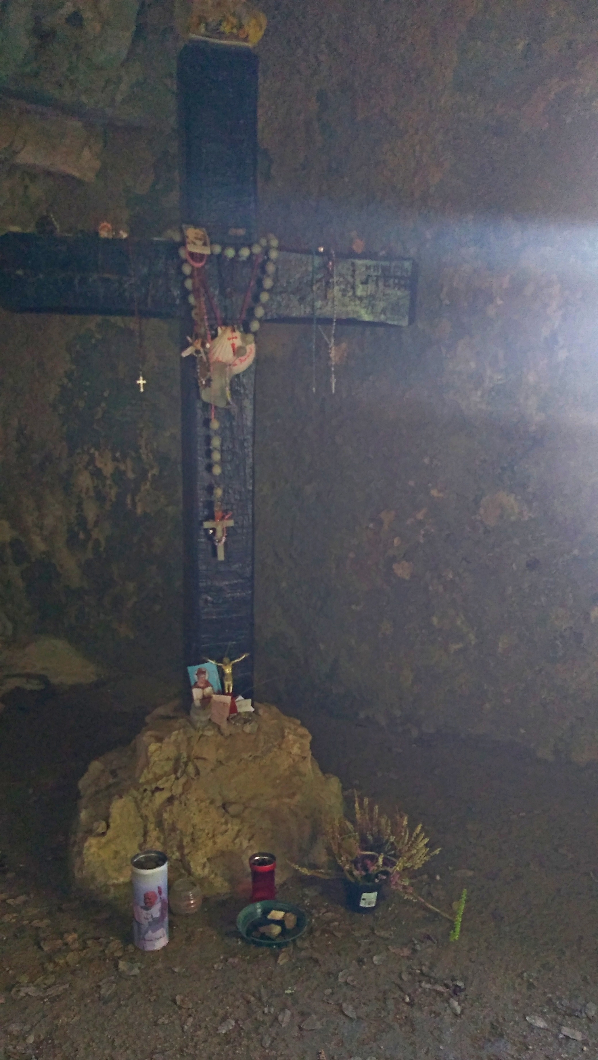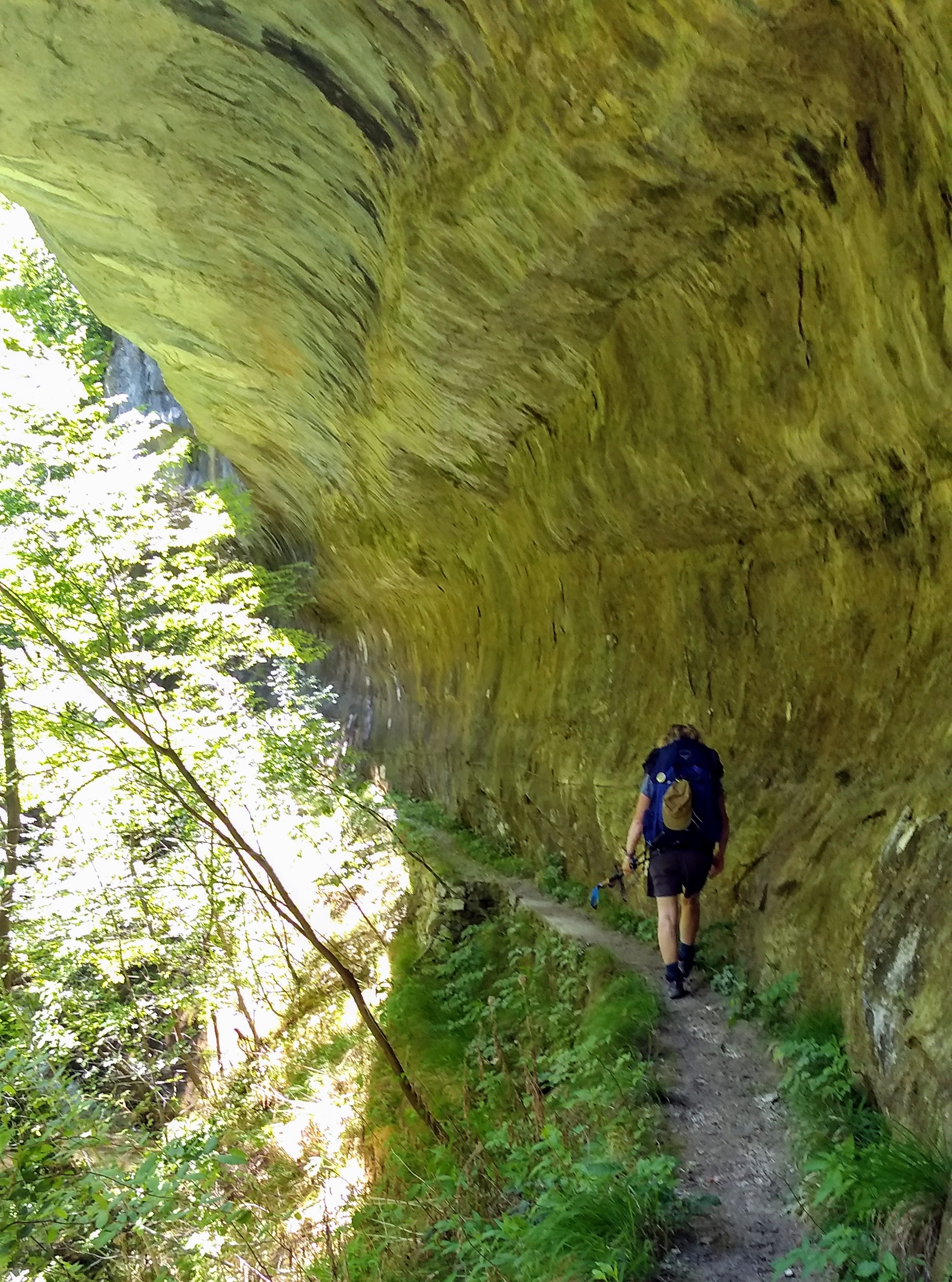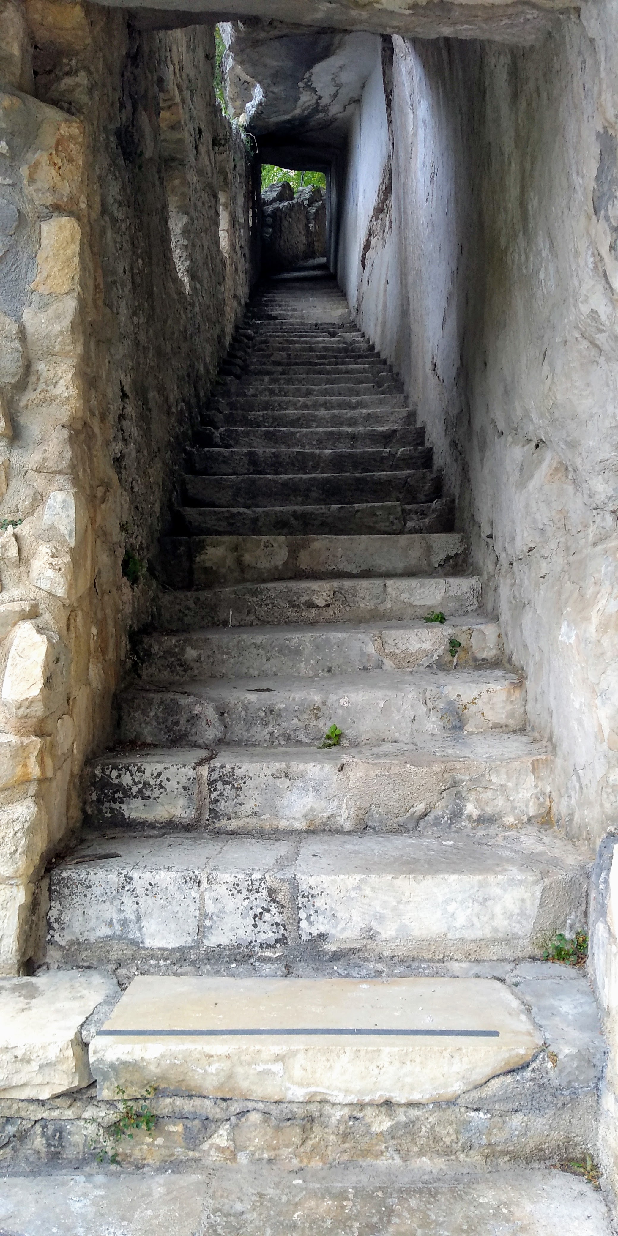 … an exposed passage on an overhanging ledge and a staircase carved onto the rock which, even being the both really short, must be considered as EE difficulty passages (Expert Hikers). The entrance into the hermitage of San Giovanni is via a staircase and then through a narrow horizontal ledge that in the final part must be done belly on the ground. The stretch, sited several meters above the ground and about 40 cm wide ( 16 inches), is not protected, therefore, the entrance is only recommended to people who are adequately equipped and trained.