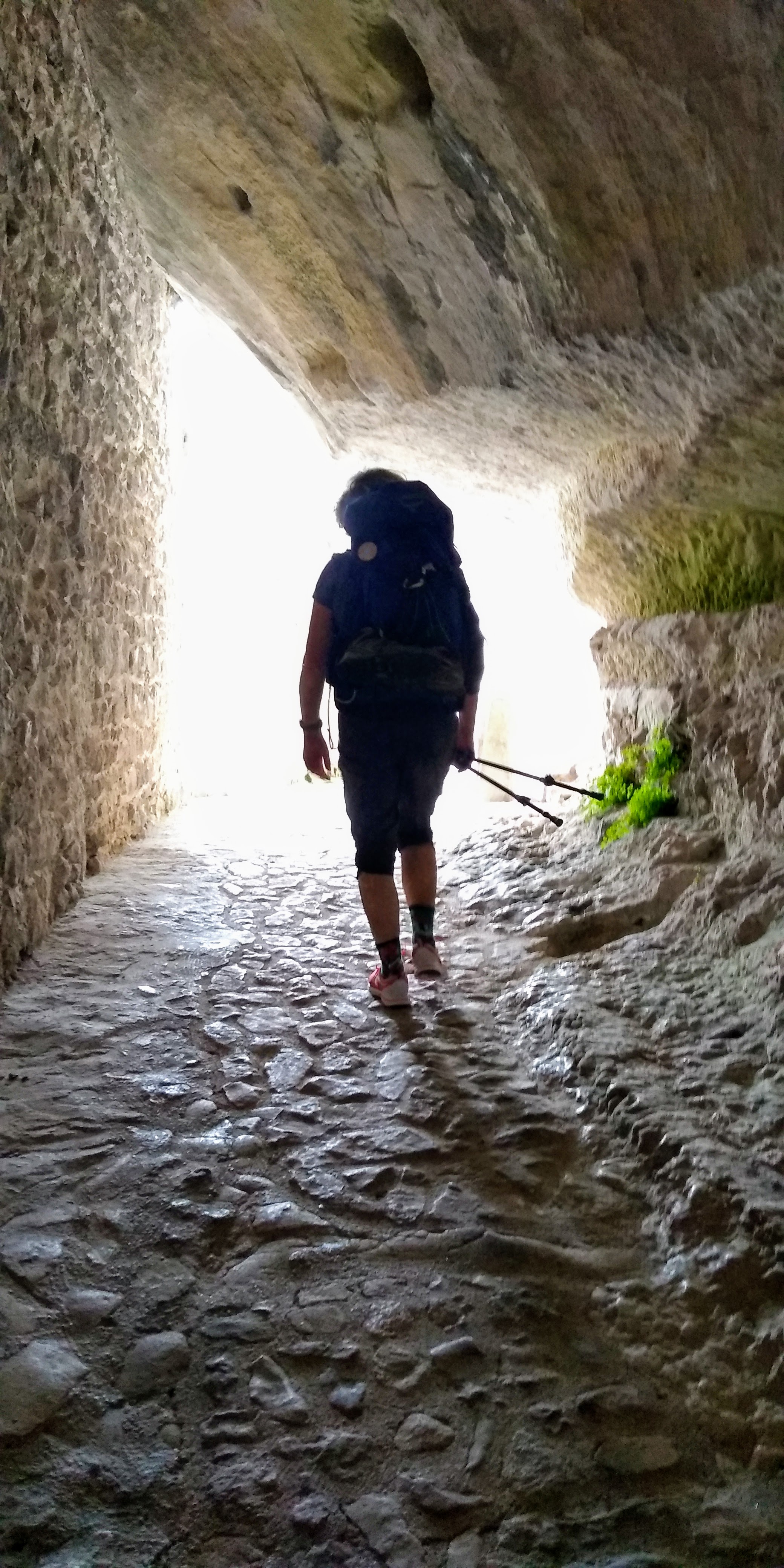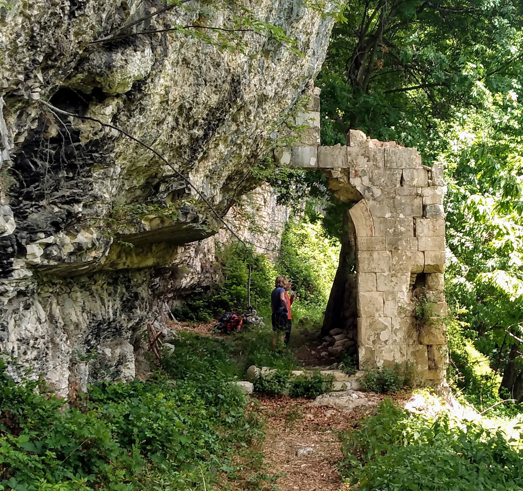 The climb moderated and we came to the side trail that would take us down to the hermitage San Giovanni all’Orfento. If you follow any Facebook Abruzzo nature sites, this is the famous hermitage where a belly crawl along a narrow ledge is required to enter the hermitage. John opted to watch our packs, as he and I both started this cammino with compromised knees due to recent injuries. At this point in the trail, a series of narrow steps were carved out of the rock heading down. Alex and I scrambled down and approached the hermitage.