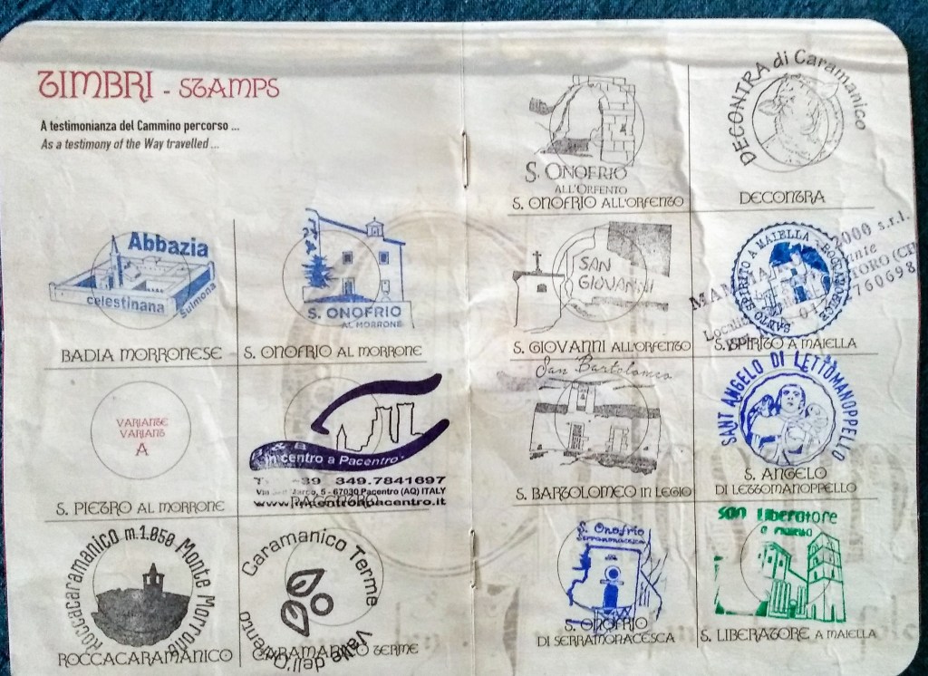 Interesting note about the hermitage San Onofrio De Serramonacesca: the rendition of the saint is clothed only in his long hair. I wish I had room in this post to go into all the spiritual nuances of the hermitages, but I leave that to the professionals on the many sites that can be found on the internet! Just know that there is much not said in this post… but experienced. After a long, precarious, rocky descent, we reached our final destination of the cammino: Abbazia Di San Liberatore in Serramonacesca. Admittedly, we were exhausted at this point.. the 6 days rushing up to us as we toured the cathedral. We had run out of steam and wanted our cammino passports stamped and to receive our certificate ‘Testimonium’. We did get all our stamps required, but our certificate would be mailed to us. We had done it – 6 days chock full of sights and wonders!