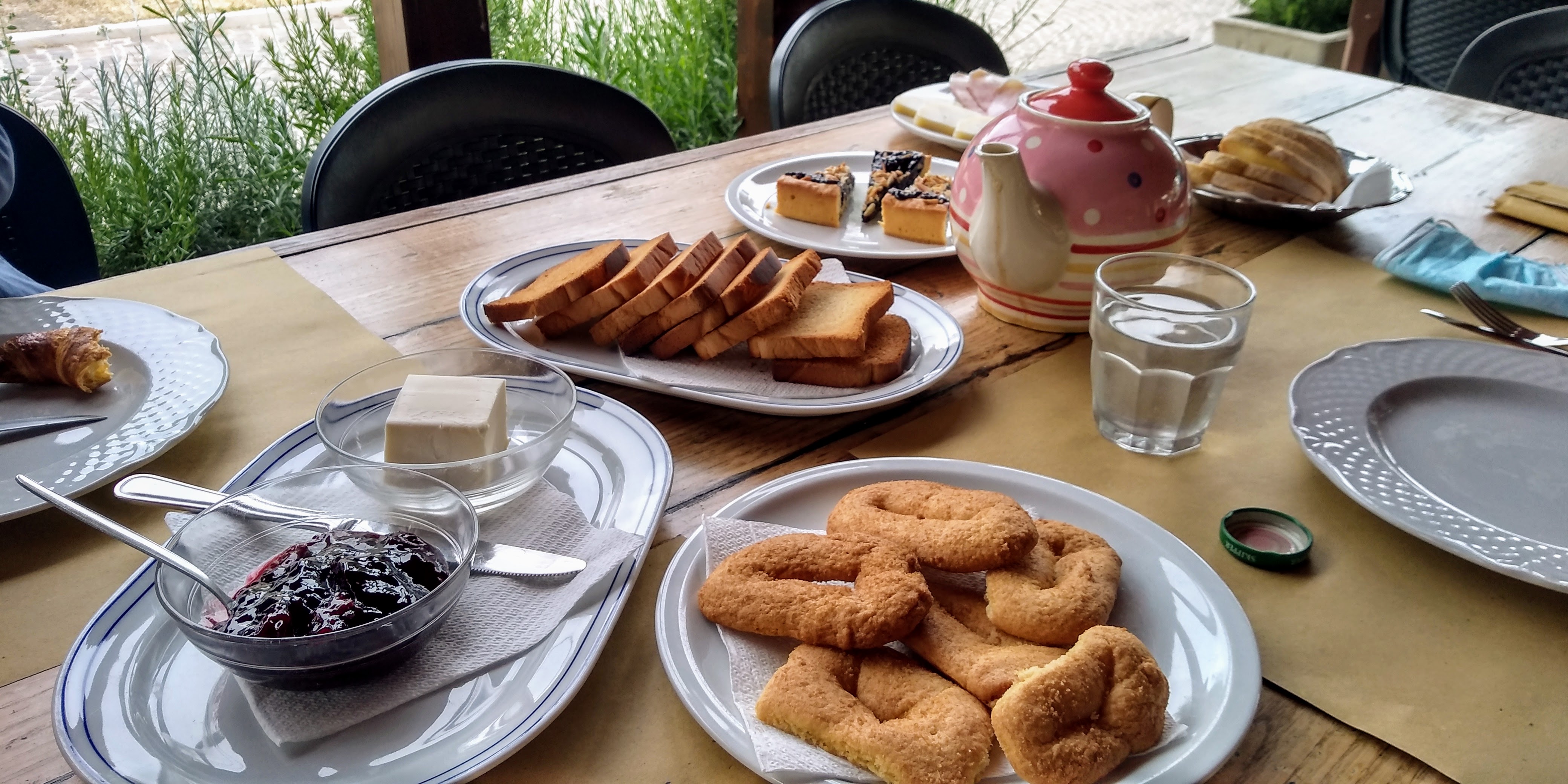To enter this valley, you are asked to register at the park office at the edge of town. Once we completed that, we headed out onto the trail, skimming the edge of the valley as we worked our way down to the river. The trail undulated through lovely forests, across footbridges, always taking us towards the top of the valley. The sound of the running water tempted us to enter, but we left the water behind for our first challenge of the cammino – Piscia Giumenta: a 100 foot long ledge equipped with a steel rope. The drop-off gave me enough pause to make my palms sweat, but I hung my hiking poles onto my pack and just hand over hand made my way. Phew… challenge accomplished and we continued on. One more river crossing before the hermitage and some slippery rocks took Alex down into the water. Thankfully just wet boots and socks, no major bumps and we climbed a short steep path to the remnants of the hermitage ‘San Onofrio All’Orfento‘. After a short visit, we returned to the valley trail then picked up a route to take us out of the valley to the hamlet of Decontra. It was an intensely hot climb to the hamlet and cold drinks awaited us and cool rooms to relax at Agri Pietrantica. Our lovely host, Marisa, bubbles with enthusiasm for the love of local foods, the heritage of the area, and the opportunity to chat with guests. We had a delicious meal of local traditional foods, but we were so intent on refueling, after our hike, that I forgot to take pictures!