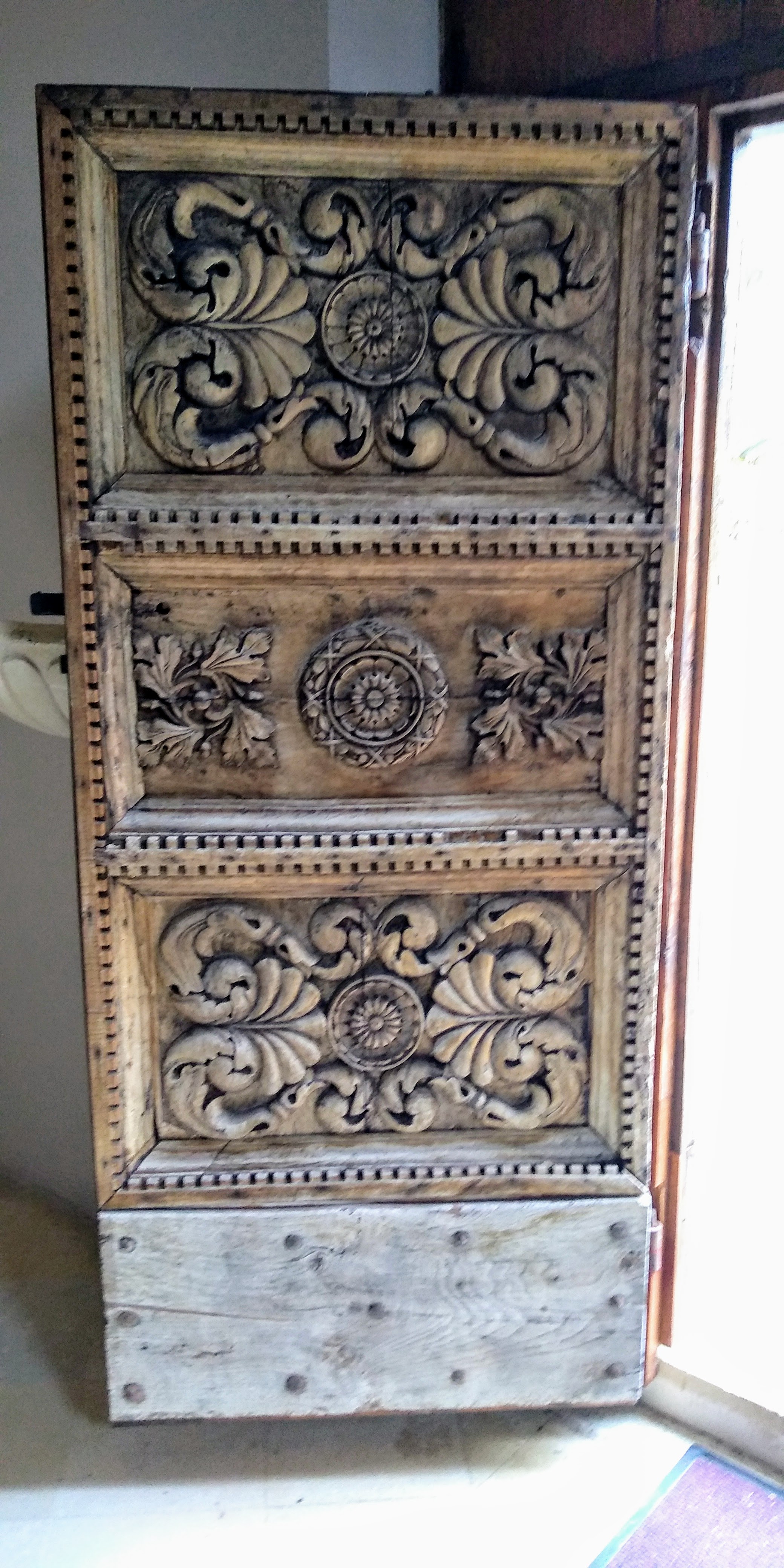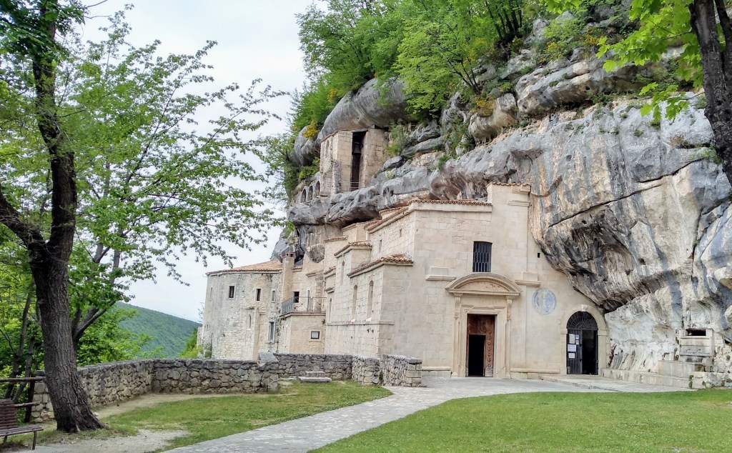 A day for another well-known and stunningly beautiful hermitage – Eremo San Spirito A Maiella. We began with the trail winding through rocky slopes to eventually enter a peaceful beech forest. The pathway was quiet and soft under foot and eventually we started to lose altitude to arrive at the hermitage. This particular hermitage can also be reached by a hard surface road so, along with it being beautiful to see, it is very accessible. The setting is impressive, set against a rock cliff, this extensive hermitage is a work of art in itself. There is a park kiosk here where we were able to get our cammino passport stamped as well as obtain tickets for a self guided tour.