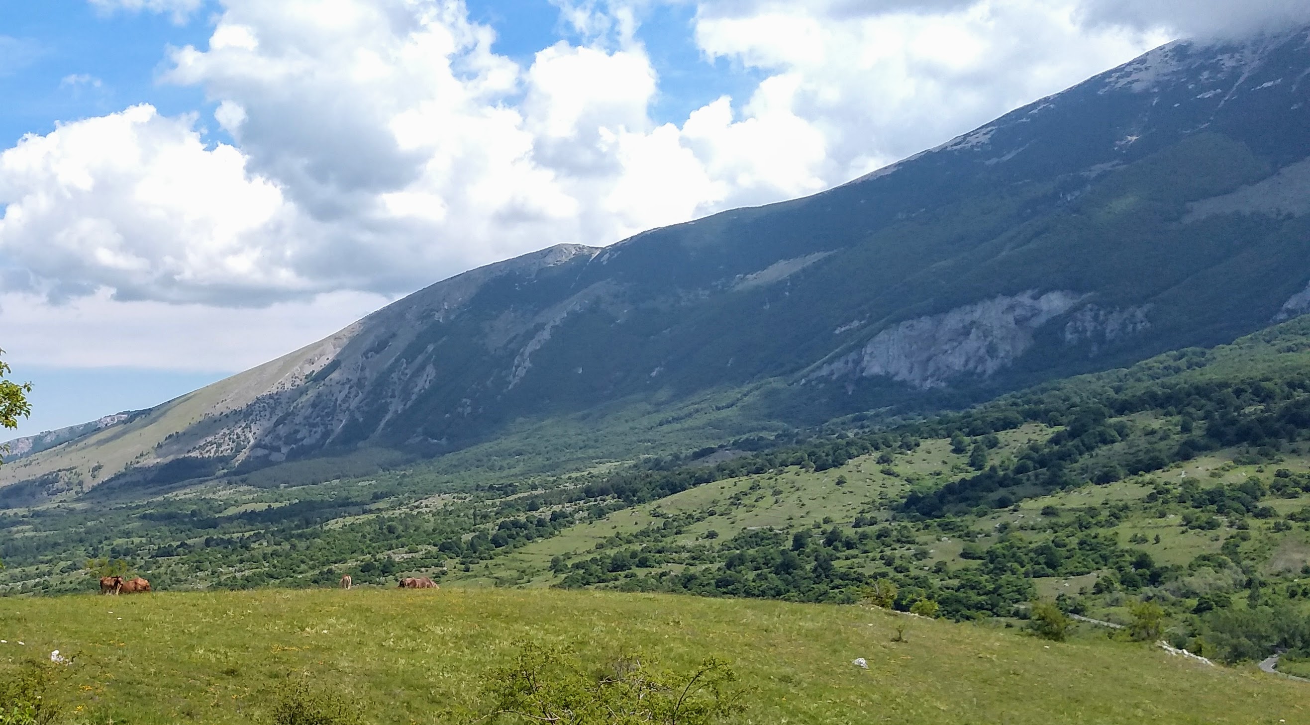 We entered the church, then worked our way through the complex of rooms & staircases, climbing higher against the cliffside. After exploring and John taking a well deserved ice cream break, we got back on the trail. Along the way, not very far from San Spirito, a man was working with his 6 horses and mules to bring firewood out of the forest. These majestic animals were bred for this work and they truly looked in their element, well fed and handled all by voice commands. We passed on by and continued our trek with the forest opening up to spacious meadows and views of the Gran Sasso.