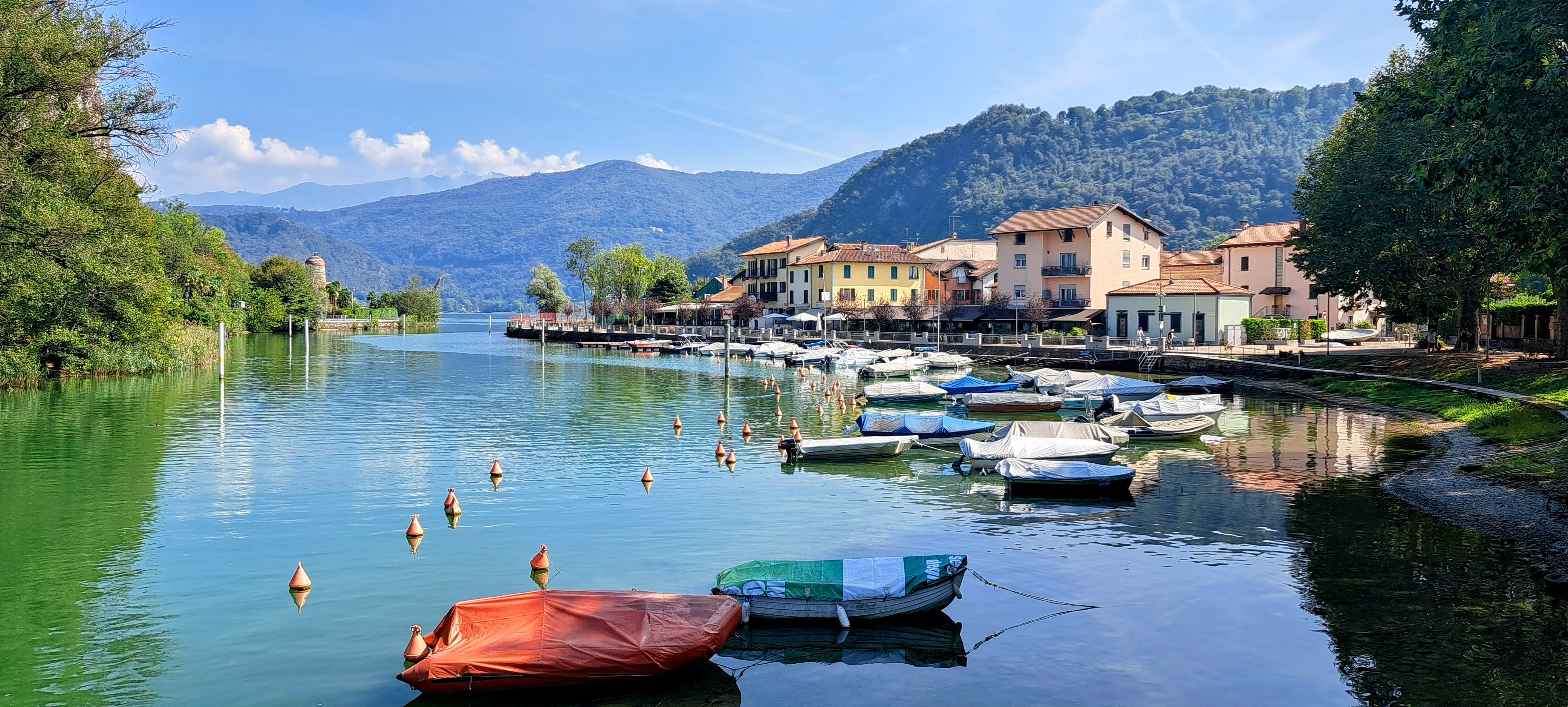 As we still had to travel from Milan to our start town of Ponte Tresa, we caught a few more trains to our destination; from Milan to Lugano, Switzerland to Ponte Tresa. After passing Lake Como and entering Switzerland, we switched to a narrower track train to take us to the lake border town of Ponte Tresa(Swiss side). Here, we walked from the station through customs control in Italy to the lakeside town of Lavena Ponte Tresa. We relaxed that evening at a lakeside hotel, had dinner in their excellent restaurant, and prepared for our next morning’s start with a good night’s sleep.