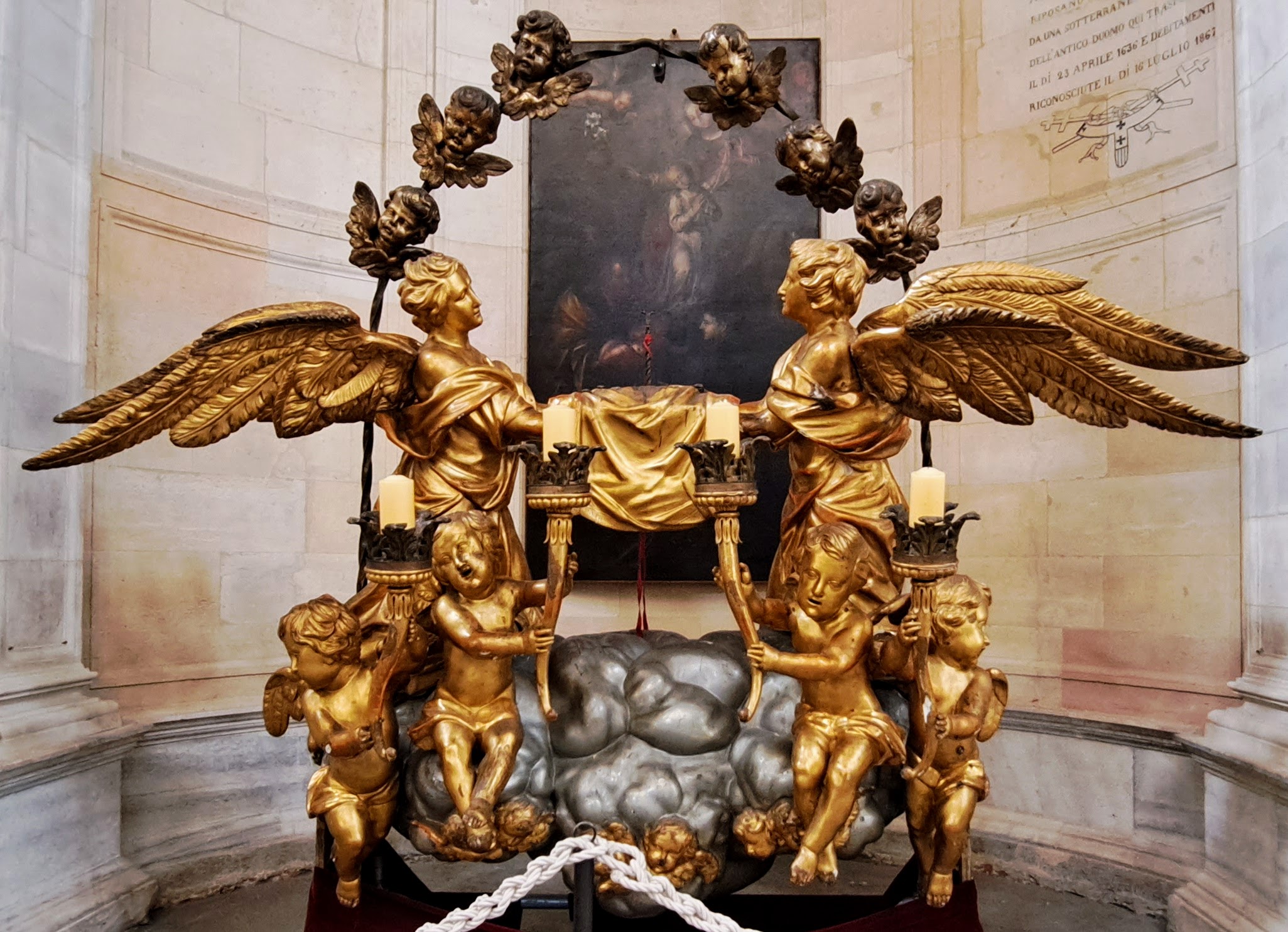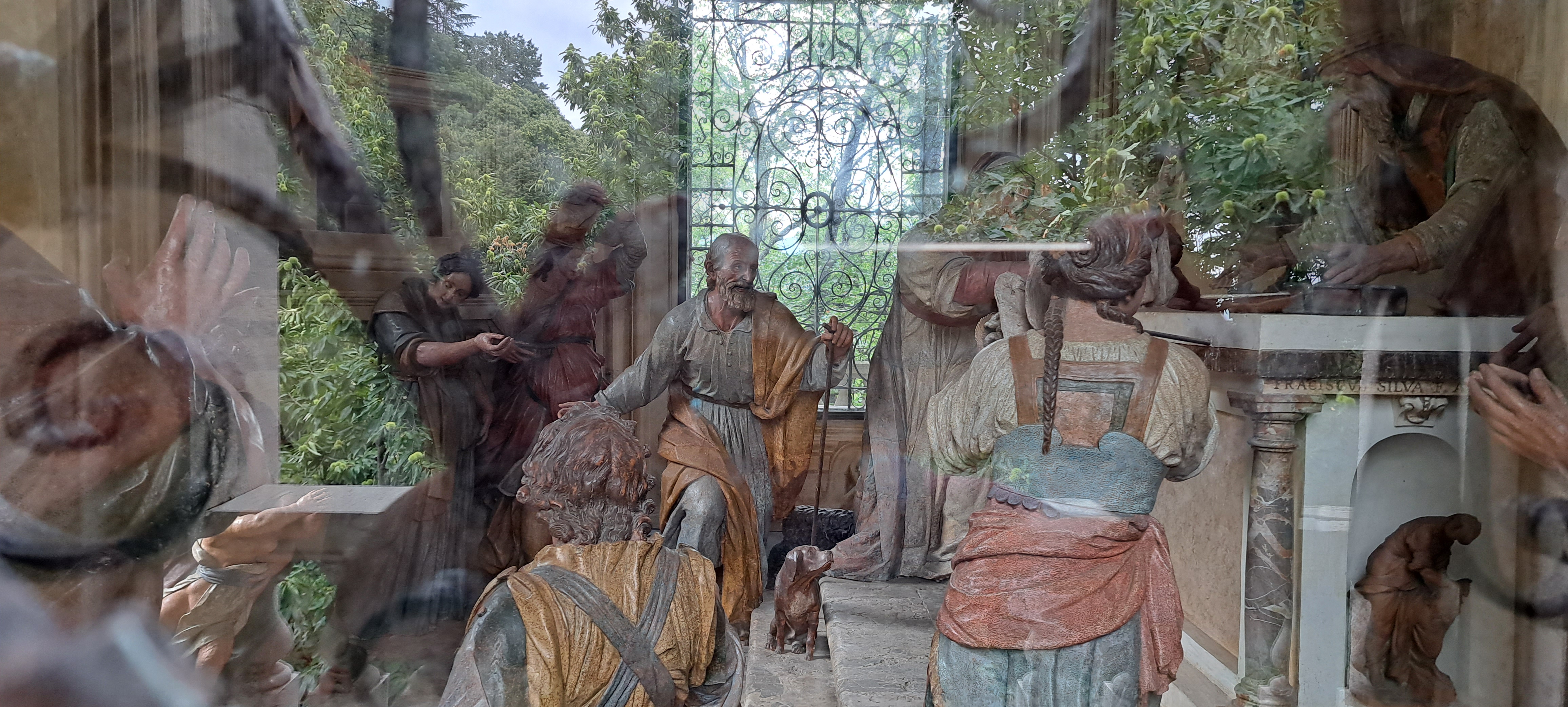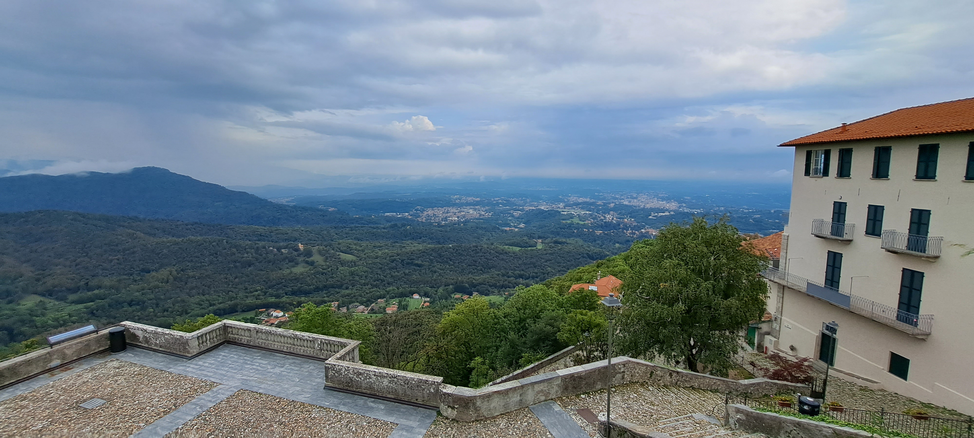 Tappa 2- From Ganna to Varese, 19km/12m. Today would be our most challenging day due to elevation gains and wet trails. The going was rough for the first hour on very rocky trails that had seen rain most of the night and into the morning. But the forests were beautiful and refreshed with the rain, as we slowly found our way to the entrance of Santa Maria del Monte. There would be more elevation to push through, but the views and multiple chapels were compelling. We stopped at the top for a well-earned lunch of gargantuan, delicious paninis at a local cafe, then a visit to the stunning Santuario di Santa Maria del Monte.