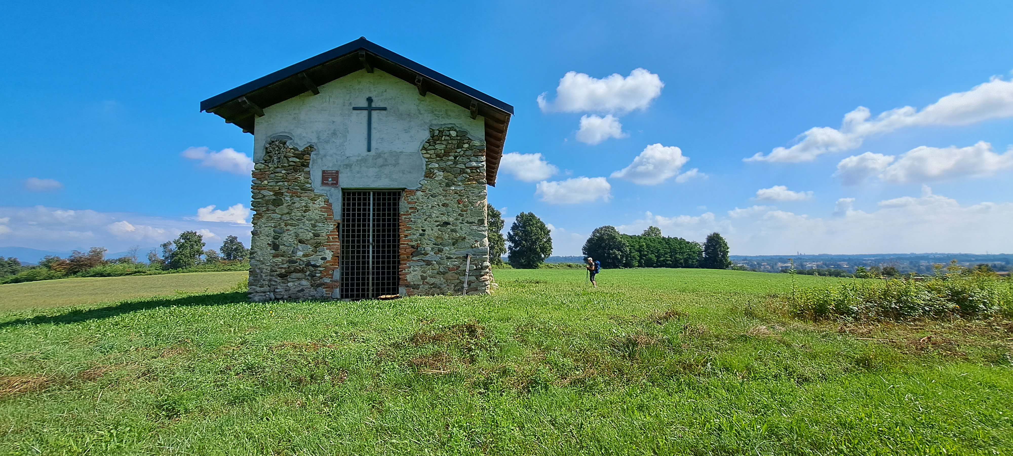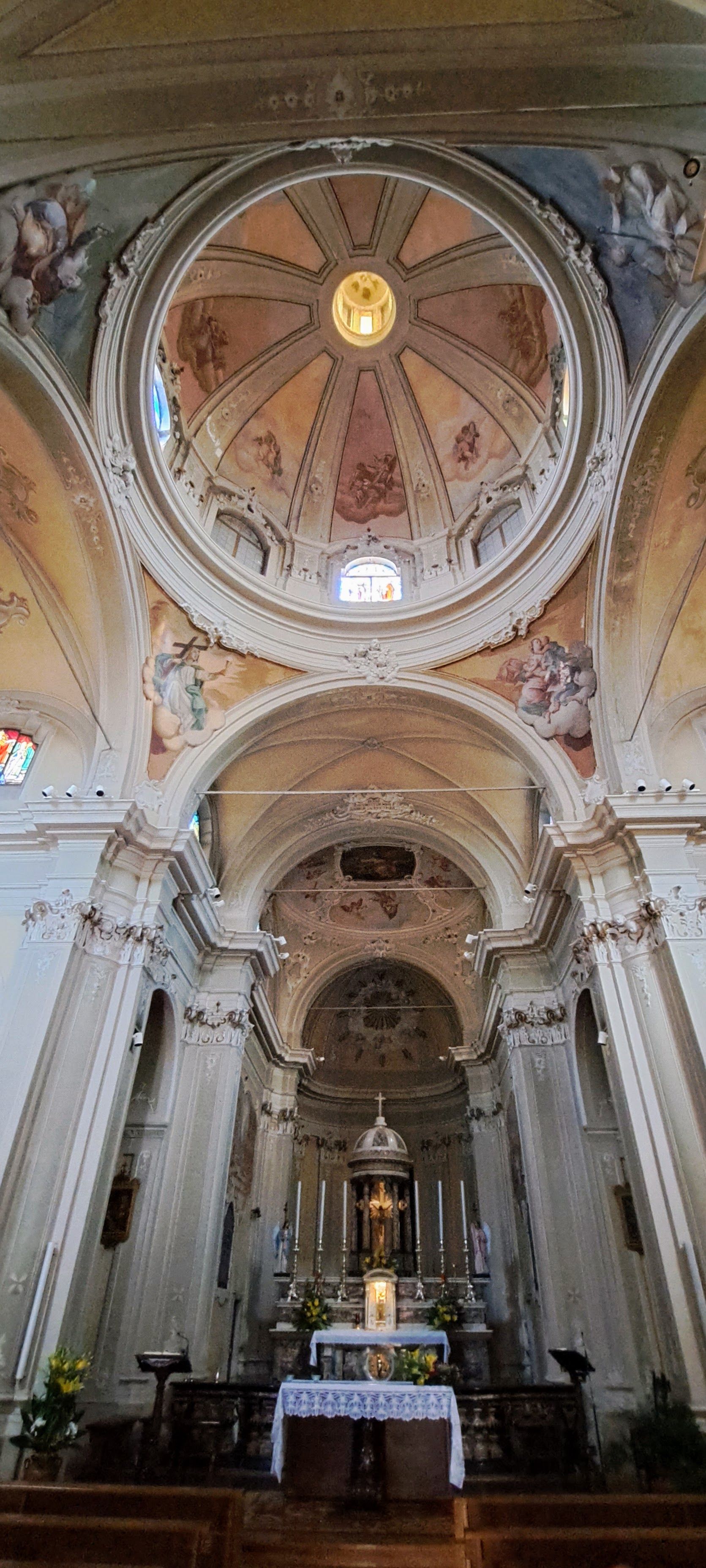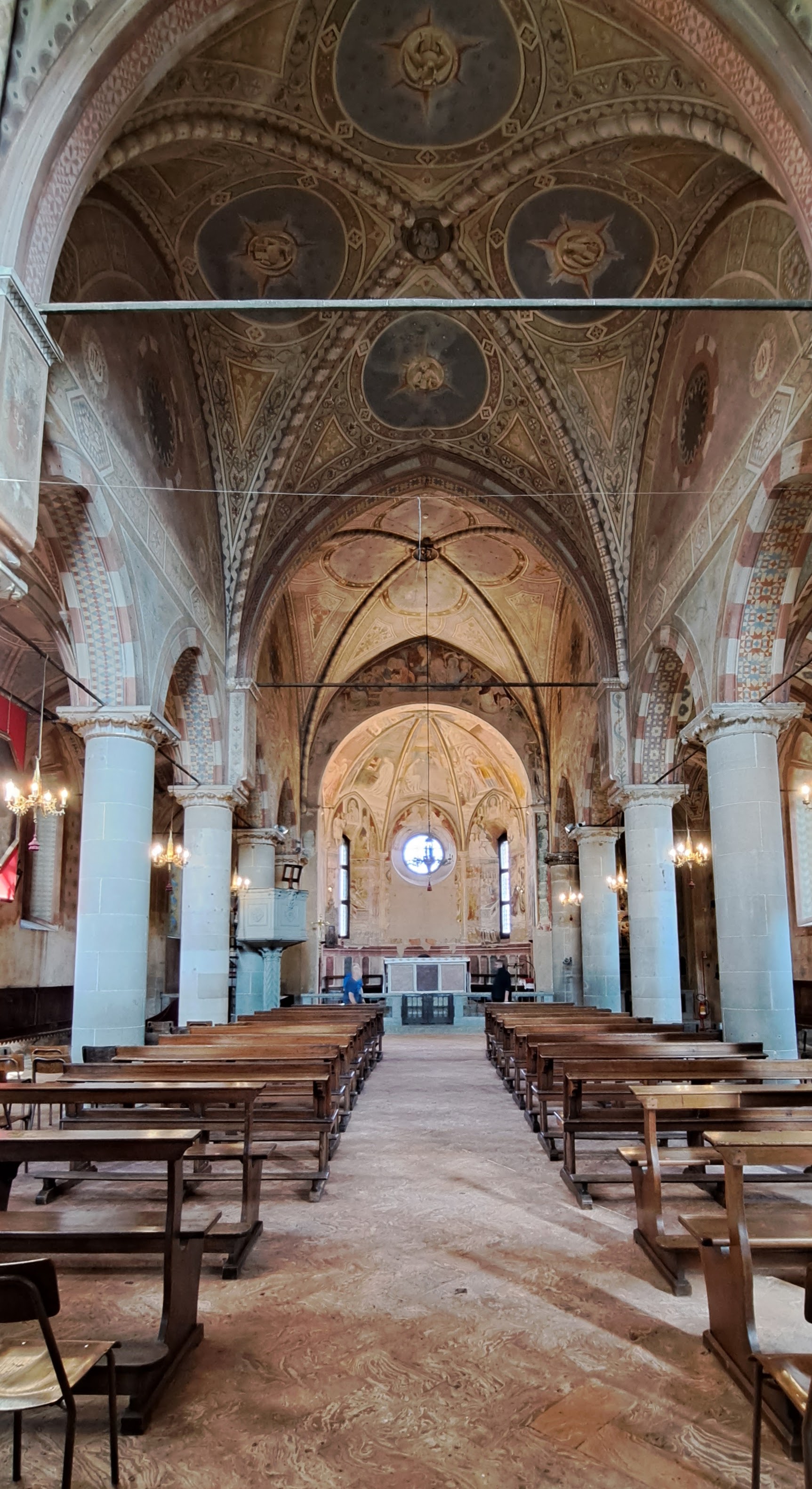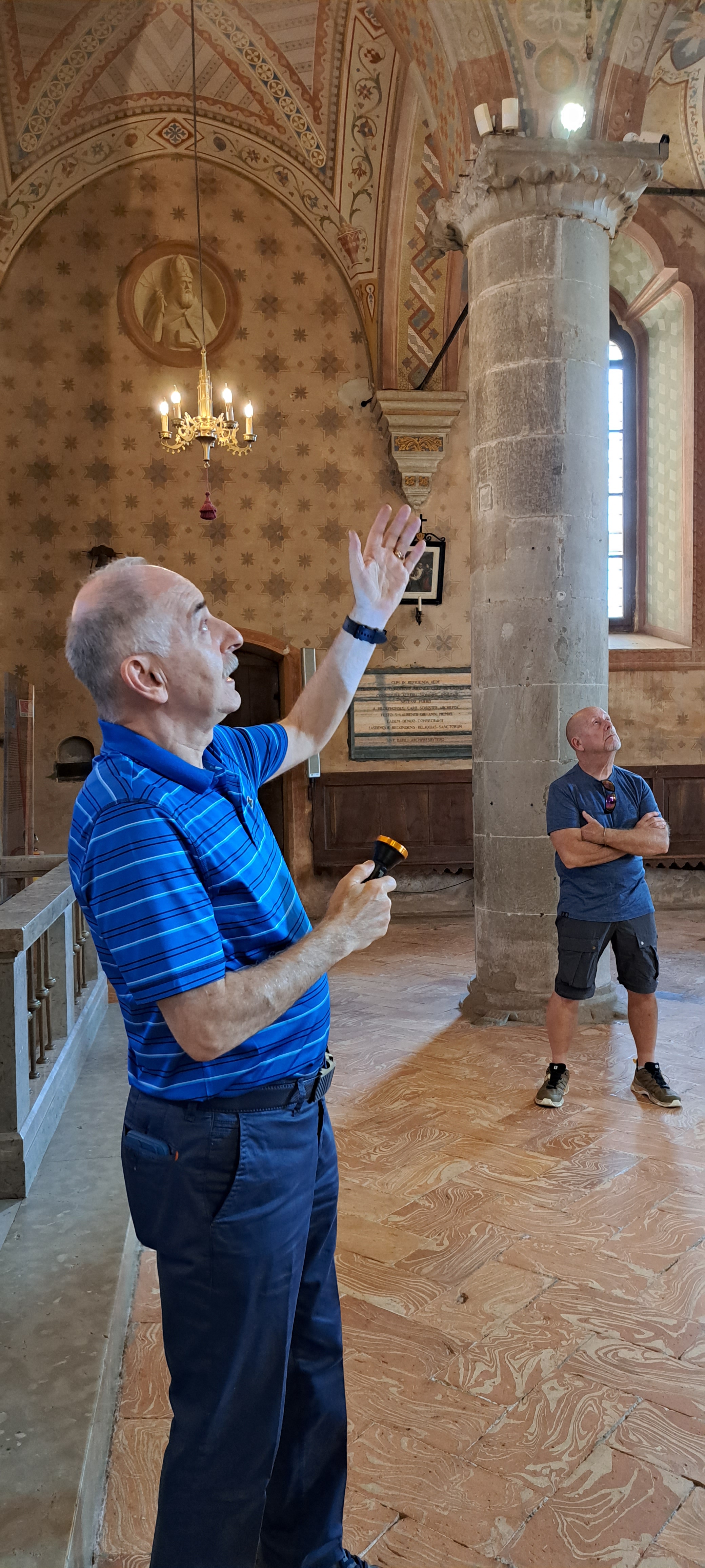 Tappa 3 today. Varese – Castiglone Olona 15km/9 m. We have now moved out of the mountains into lower elevations. The morning was filled with lovely wide-open vistas and fields and a well-preserved stone chapel. Our lunch stop was at a local takeaway pizzeria.. hmmm. How could we manage this? John’s hilarious but ingenious transport worked brilliantly as we searched for a comfortable place to eat along the trail. We enjoyed some appertivo time at a local bar in the historic center of Castiglione Olano and topped off the day with a very detailed and interesting tour of Chiesa Collegiata dei Santi Stefano e Lorenzo. Our guide was outstanding!