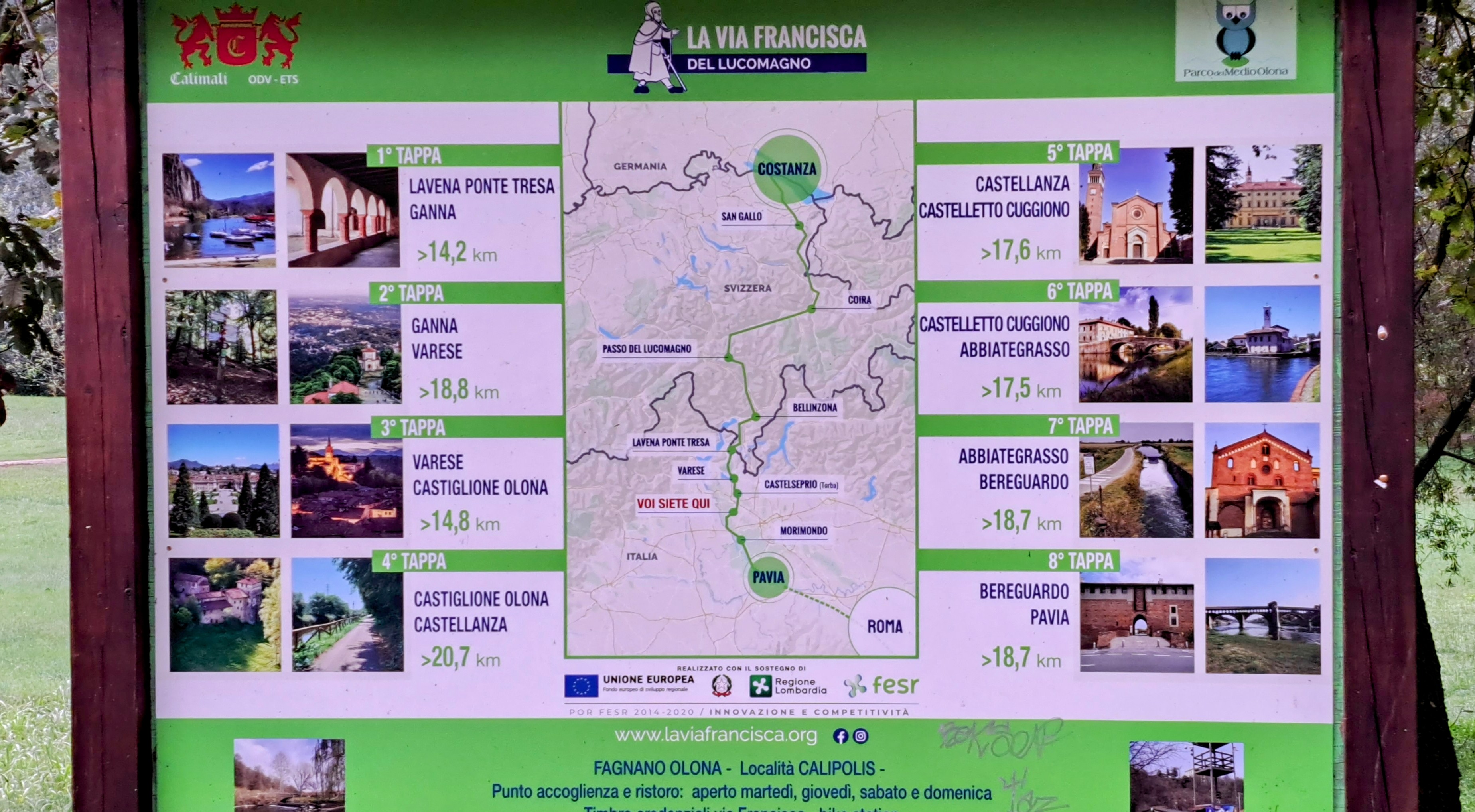 John and I have been adding a cammino a year to our vacation time these past 5 years. We’ve found that not only do they satisfy our love for trekking, but they give us an opportunity to experience new areas, towns, food and whatever we get to see or do on each day of the trip. Our most recent cammino took place in the northern region of Lombardy, Italy. The complete cammino starts in Costanza, Switzerland, but we opt to do the Italian section: an 8 tappa (day) 135 km walk. This camino begins in the lake town of Lavena Ponte Tresa and is completed in the university city of Pavia. With a few added days prior and post cammino, our time in Lombardy totaled 12 days, our first time exploring this region.