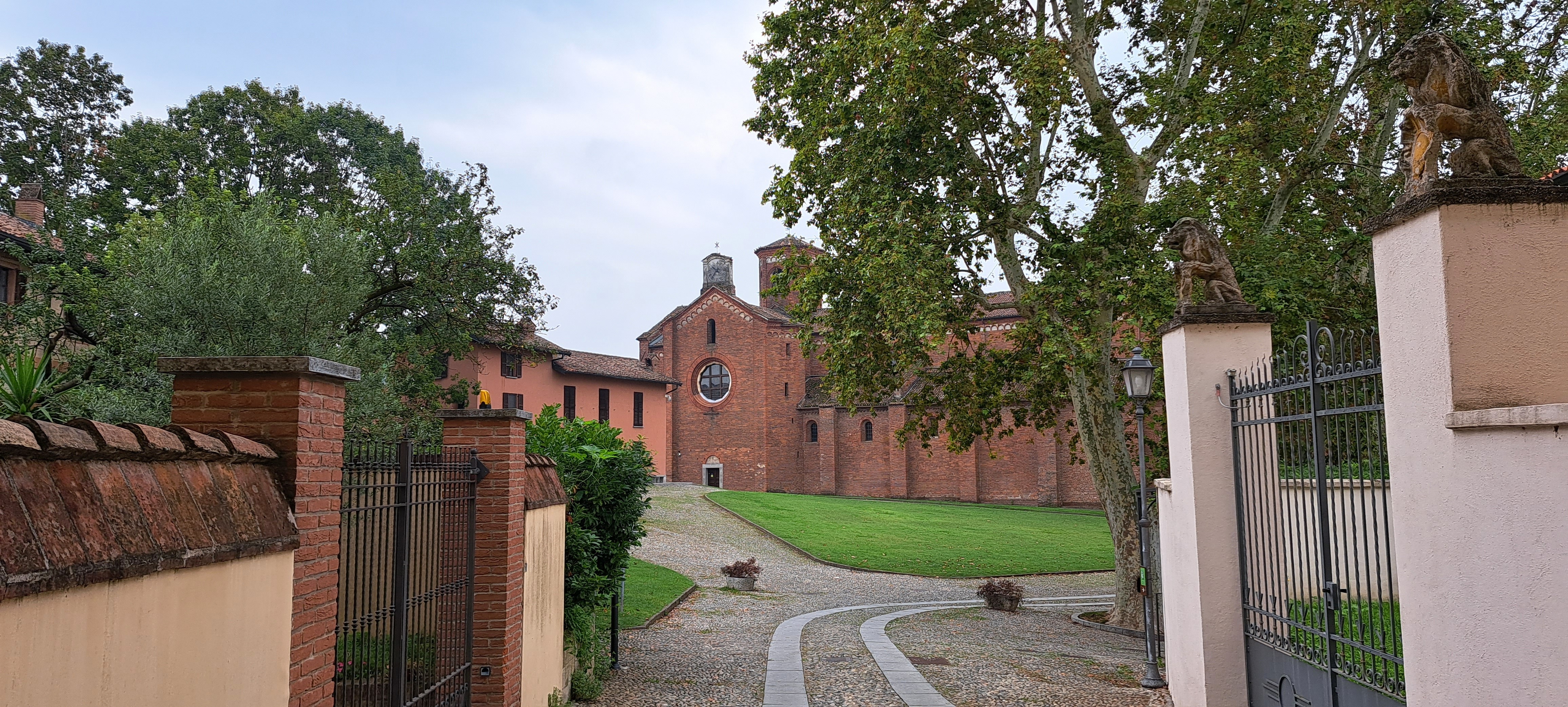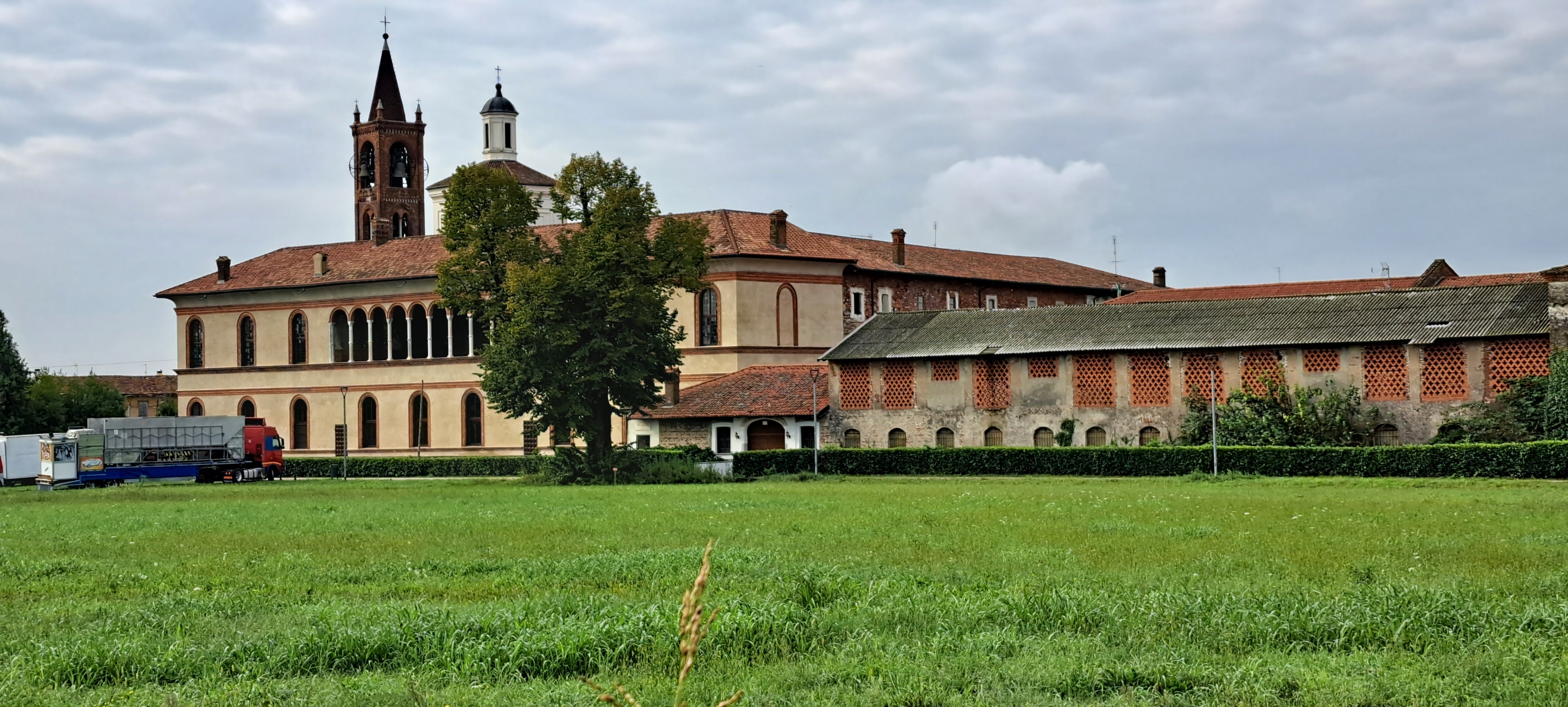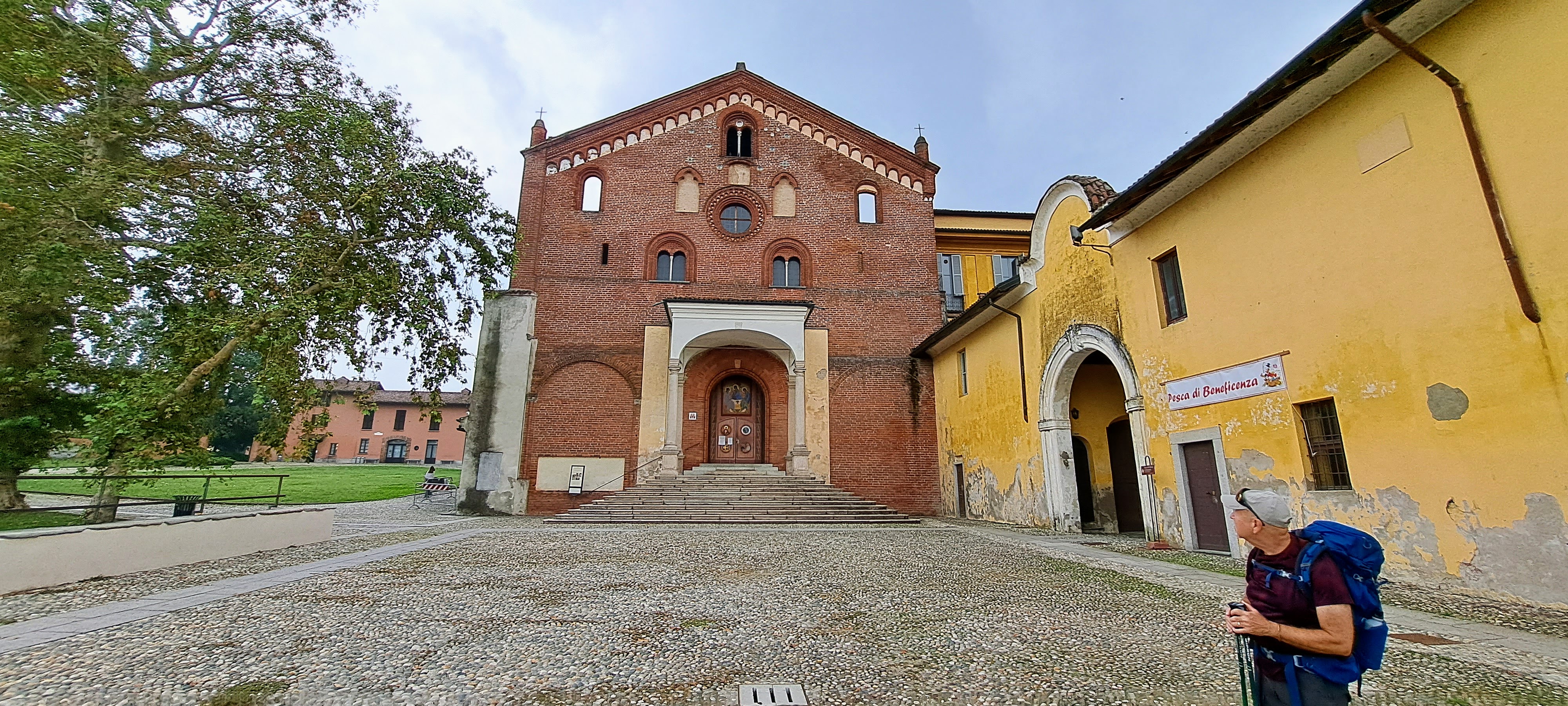 Tappa 7….Abbiategrasso to Bereguardo.19km/11.8m Today, we are heading south beside a different canal, giving us long views across rice fields, canal locks and spillways. Along the way, we stopped at the commanding Abbazia di Morimondo, but unfortunately, we arrived during off hours.