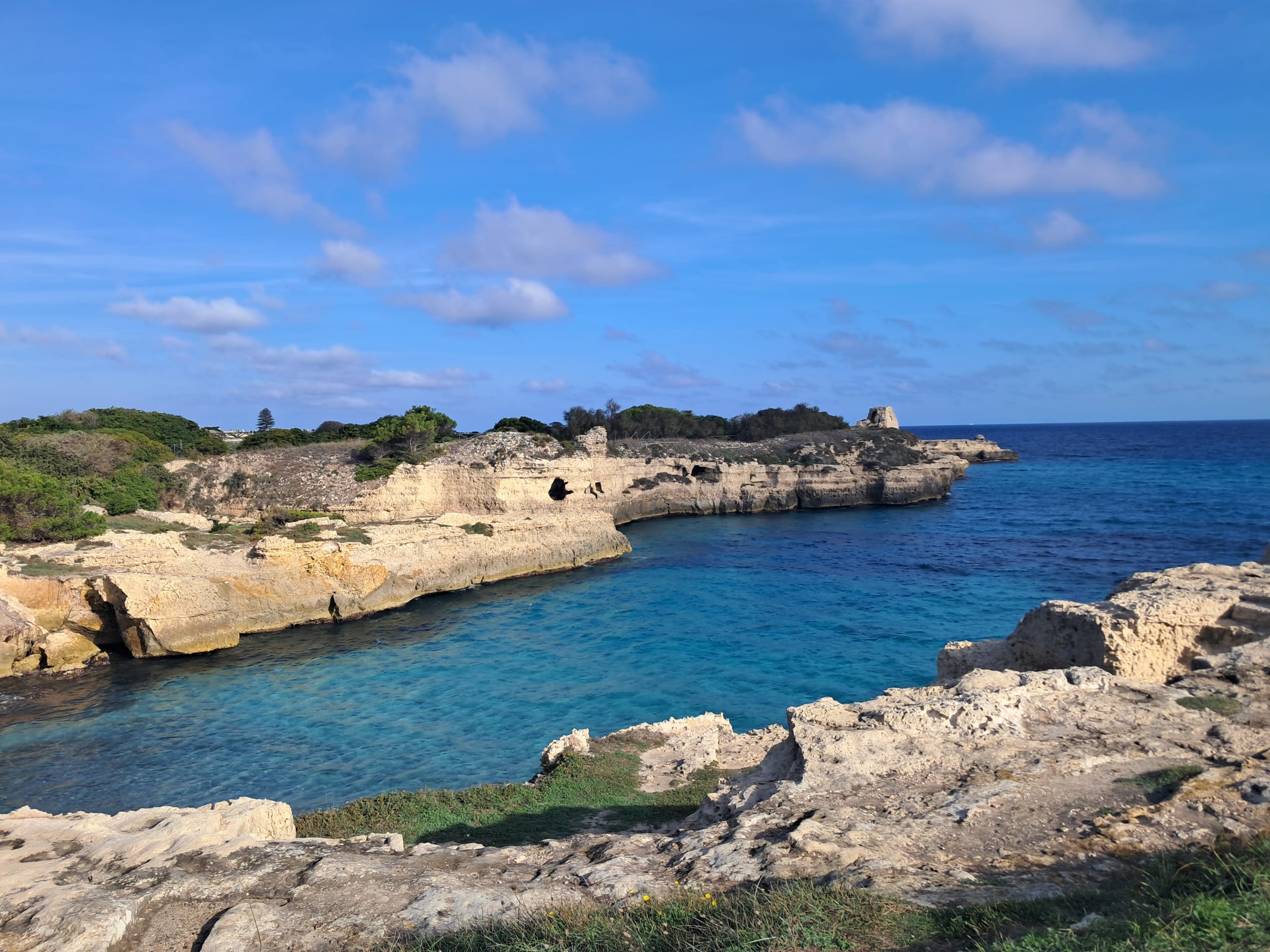 TAPPA 2 San Foca to Otranto. 24.6km /15.2m. The most beautiful rock formations in the gorgeous blue sea. We would experience the beauty of La Grotta della Poesia, Le Due Sorelle and Faraglioni di Torre Sant’Andrea, all stunning rock formations in this section of the trail. Group those with deep, cool pine forests, historic towers, stone fenced pastures, and many more grottos, we’re loving our slow cammino. We arrive in the fortified town of Otranto on our fourth day.