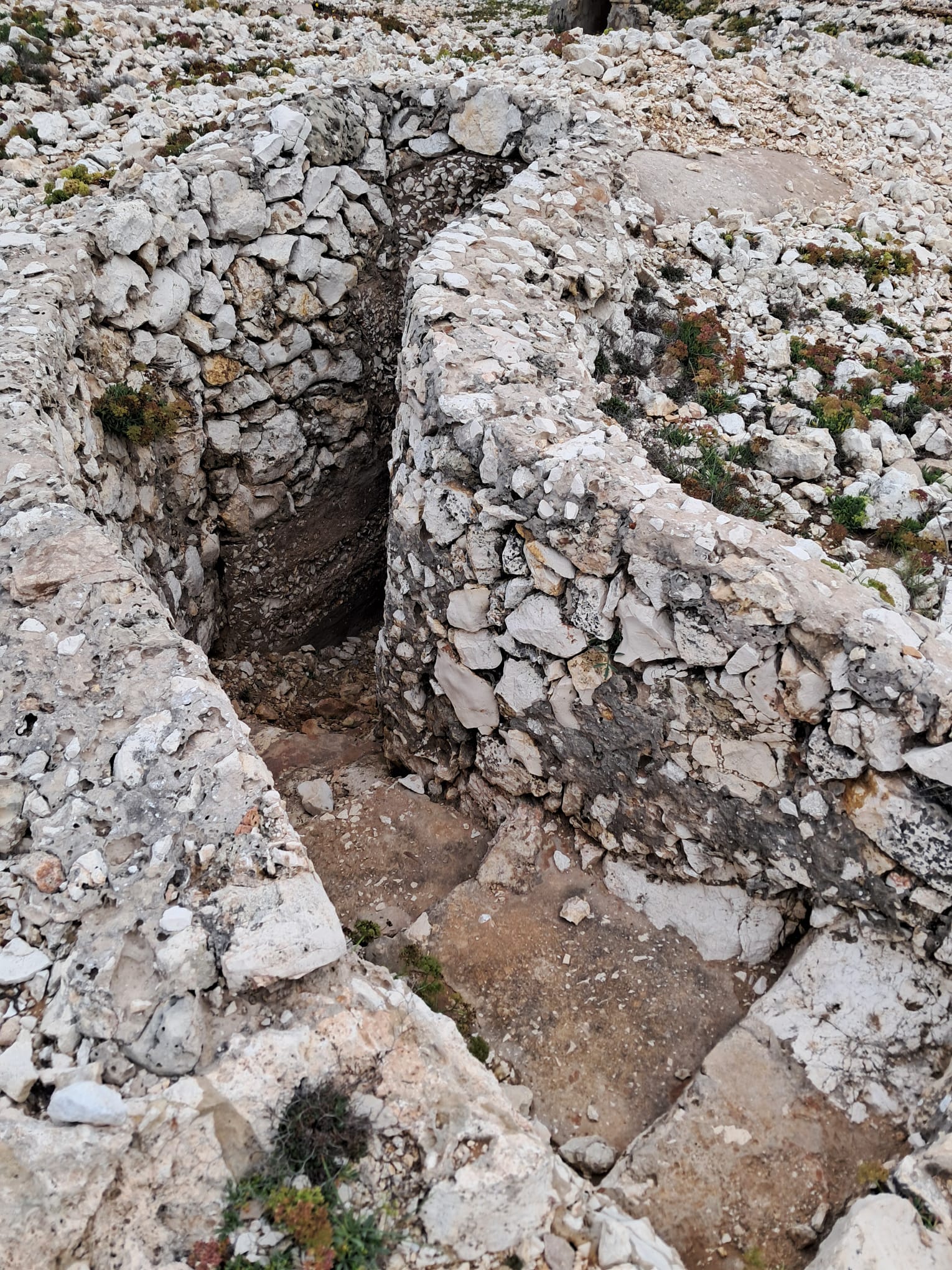 The climb moderated and we came to the side trail that would take us down to the hermitage San Giovanni all’Orfento. If you follow any Facebook Abruzzo nature sites, this is the famous hermitage where a belly crawl along a narrow ledge is required to enter the hermitage. John opted to watch our packs, as he and I both started this cammino with compromised knees due to recent injuries. At this point in the trail, a series of narrow steps were carved out of the rock heading down. Alex and I scrambled down and approached the hermitage.