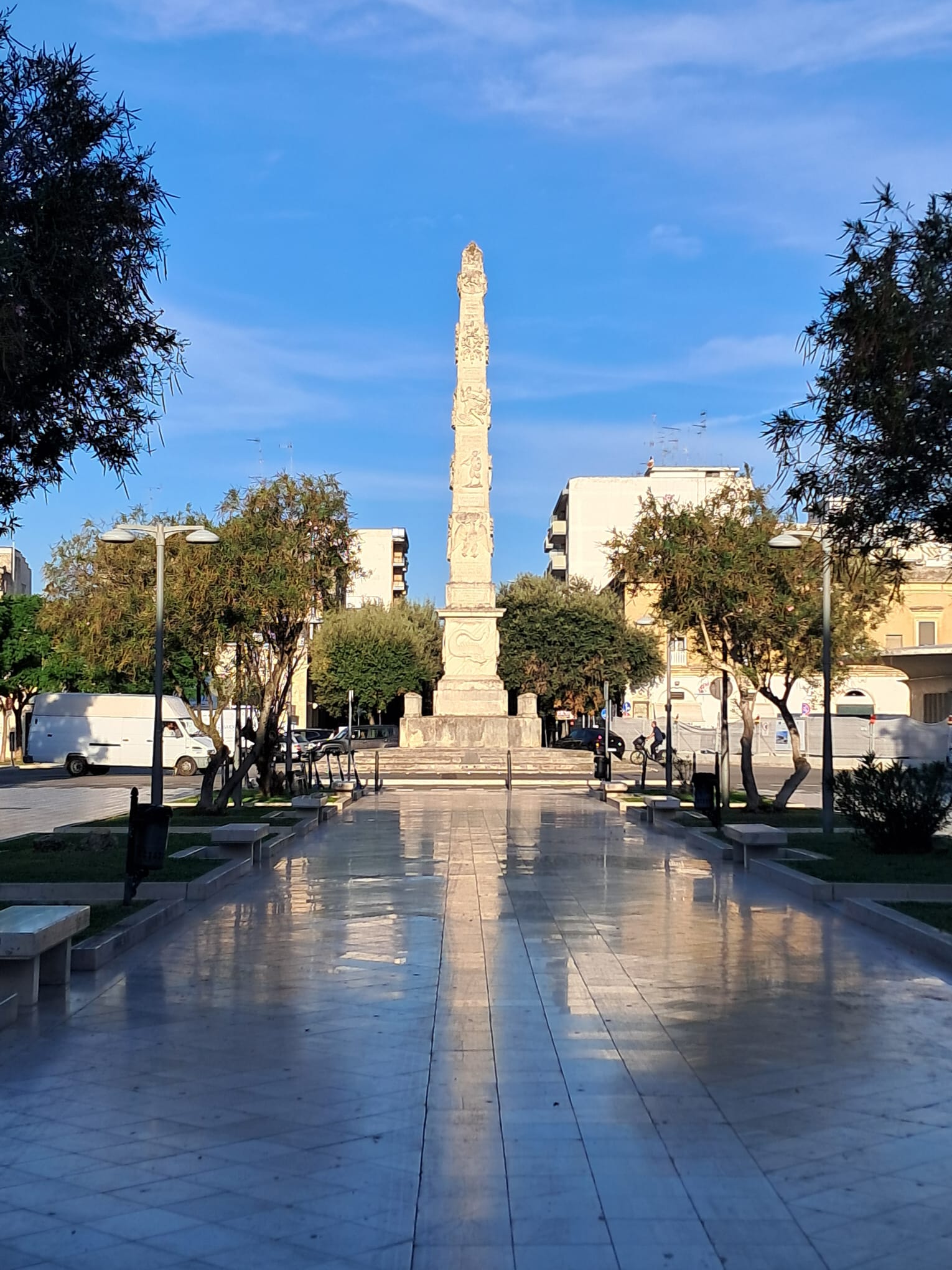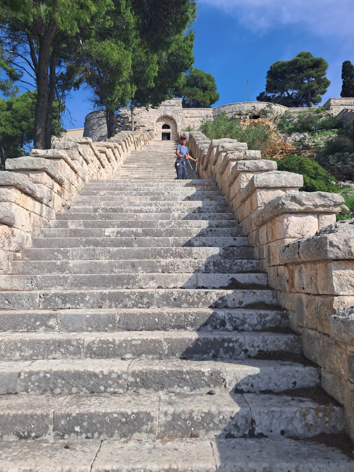 Crispiano – Taranto, 24.5km/15.2m. We have arrived at our last stage … excited, tired but ready to see what today’s trails were like and to reach Taranto on the Ionian Sea. We were surprised at the diversity, open plains, rocky trails through scrub growth, wide grassy roads through groves of ancient olive trees. Just a very interesting and satisfying day to end our 6-day cammino. We arrived in Taranto midafternoon, got our final passport stamp and threw our travel stone into the sea at the Sailors’ Monument.
