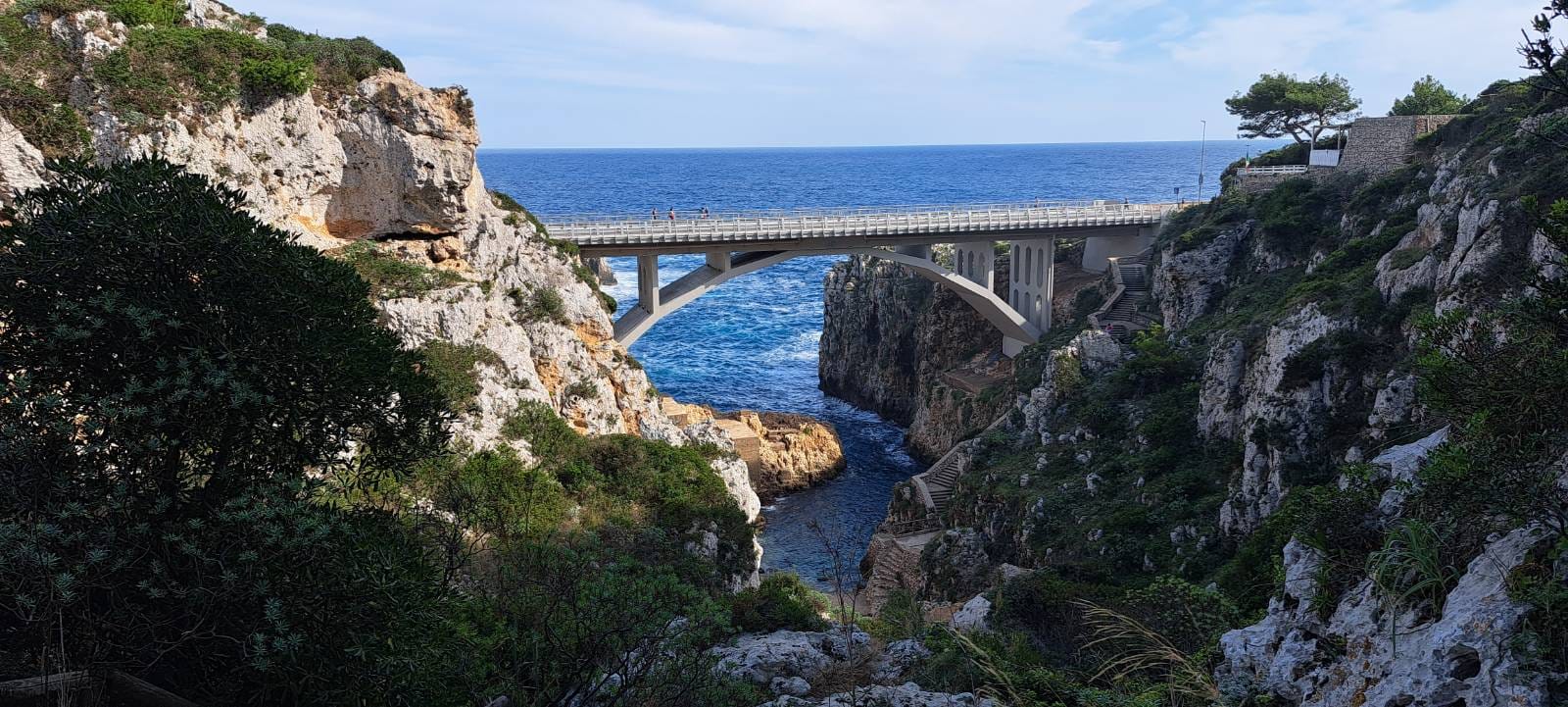TAPPA 5 Marina Serra to Santa Maria di Leuca. 22.3km/13.8m This tappa we split into 2 days. The first half was 14.5km/9m, starting along the boardwalk of Marina Serra then on to roughest, toughest day of our cammino. The trail climbed up out of the marina to connect to the rockiest trail that went on and on and on. We really had to watch our footing as we both chose to wear trail runners for this cammino. The trail markers were few and far between and at one point we missed a turn and almost flew off a cliff. BUT the day was beautiful. We crossed the Ponte Ciolo and headed inland to our destination town, Gagliano del Capo. Once again, a delicious dinner at a local restaurant and a quiet night at a lovely apartment.