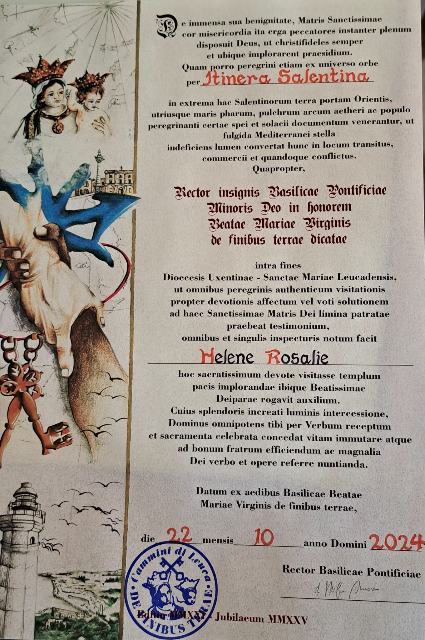 At the Santuario, we would receive our “testimonium”, a diploma of sorts for completion of all the daily stages. We would show our stamped passports, confirming all the stops along the way, and the secretary would carefully enter the day and our names. Unfortunately, the secretary wasn’t available that afternoon, so we returned then next day (our relax day) to obtain our testimoniums. Our slow cammino of 9 days had come to a successful end. We would rest for a full day in town before heading home.