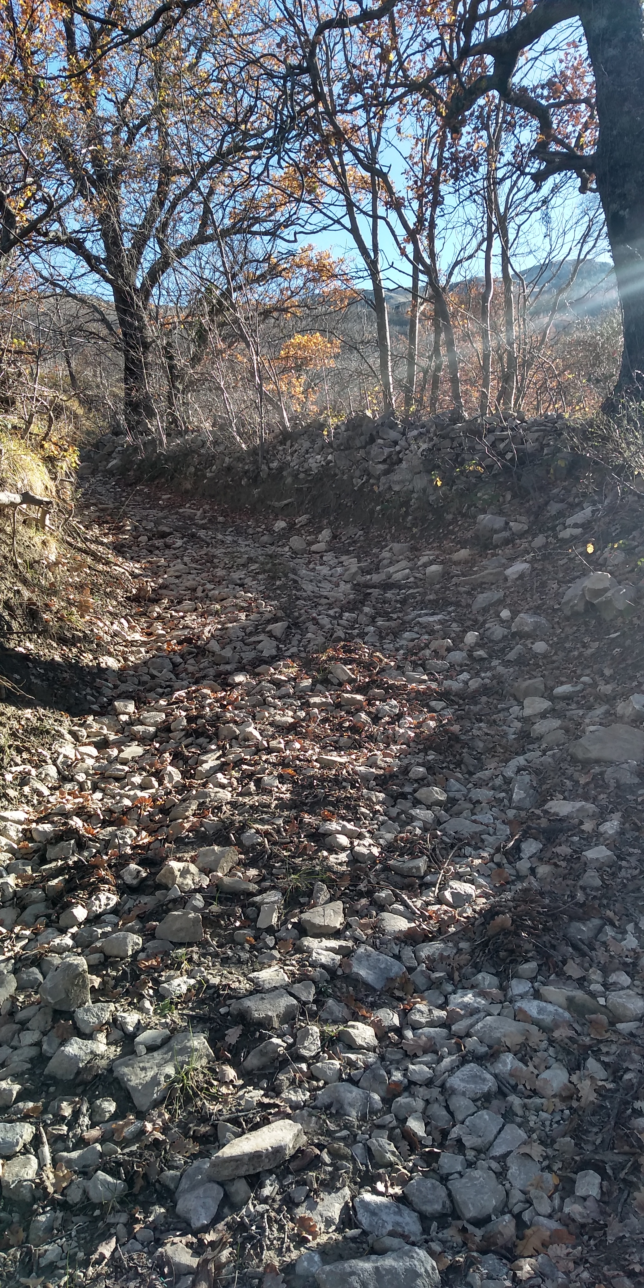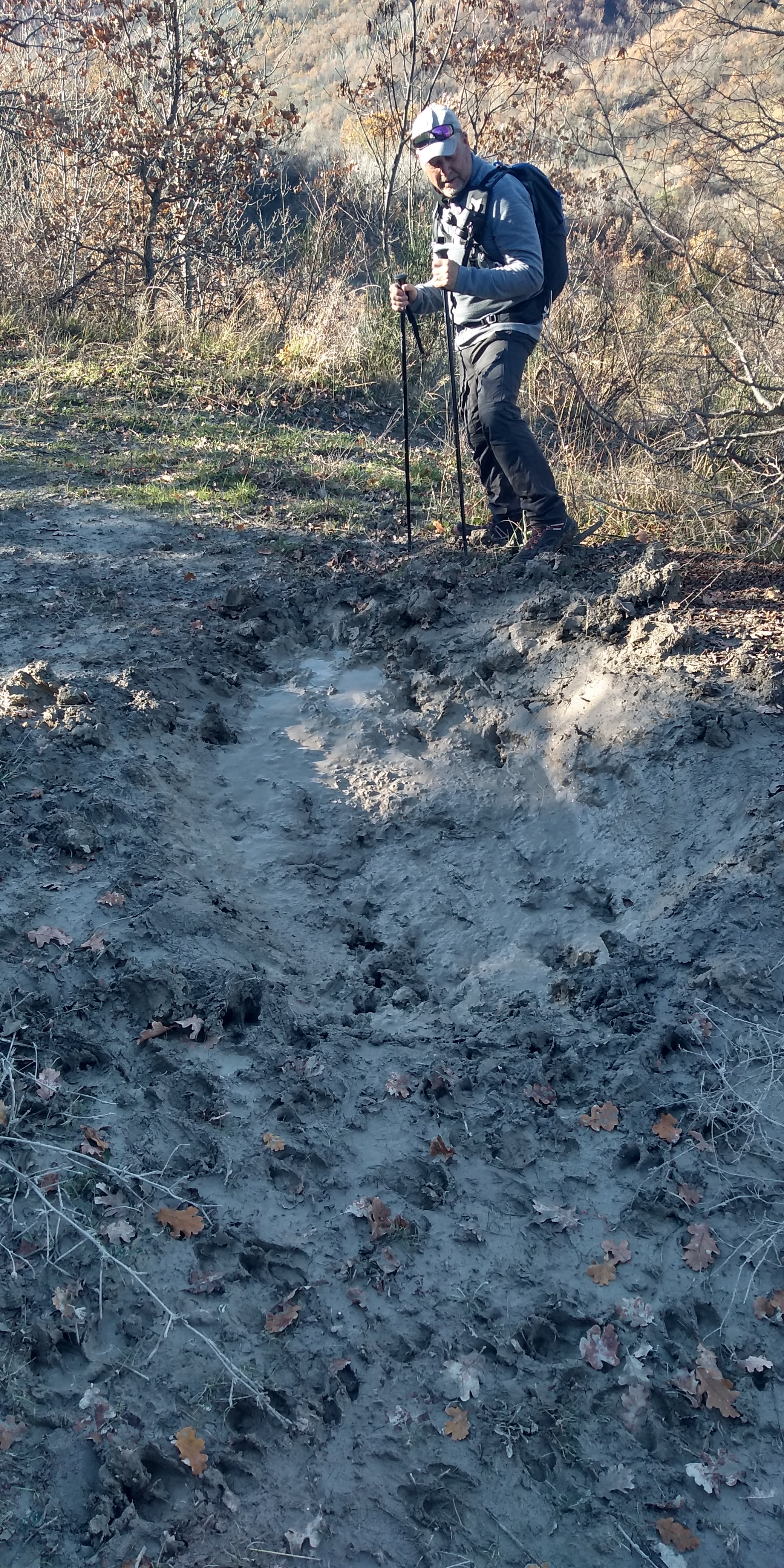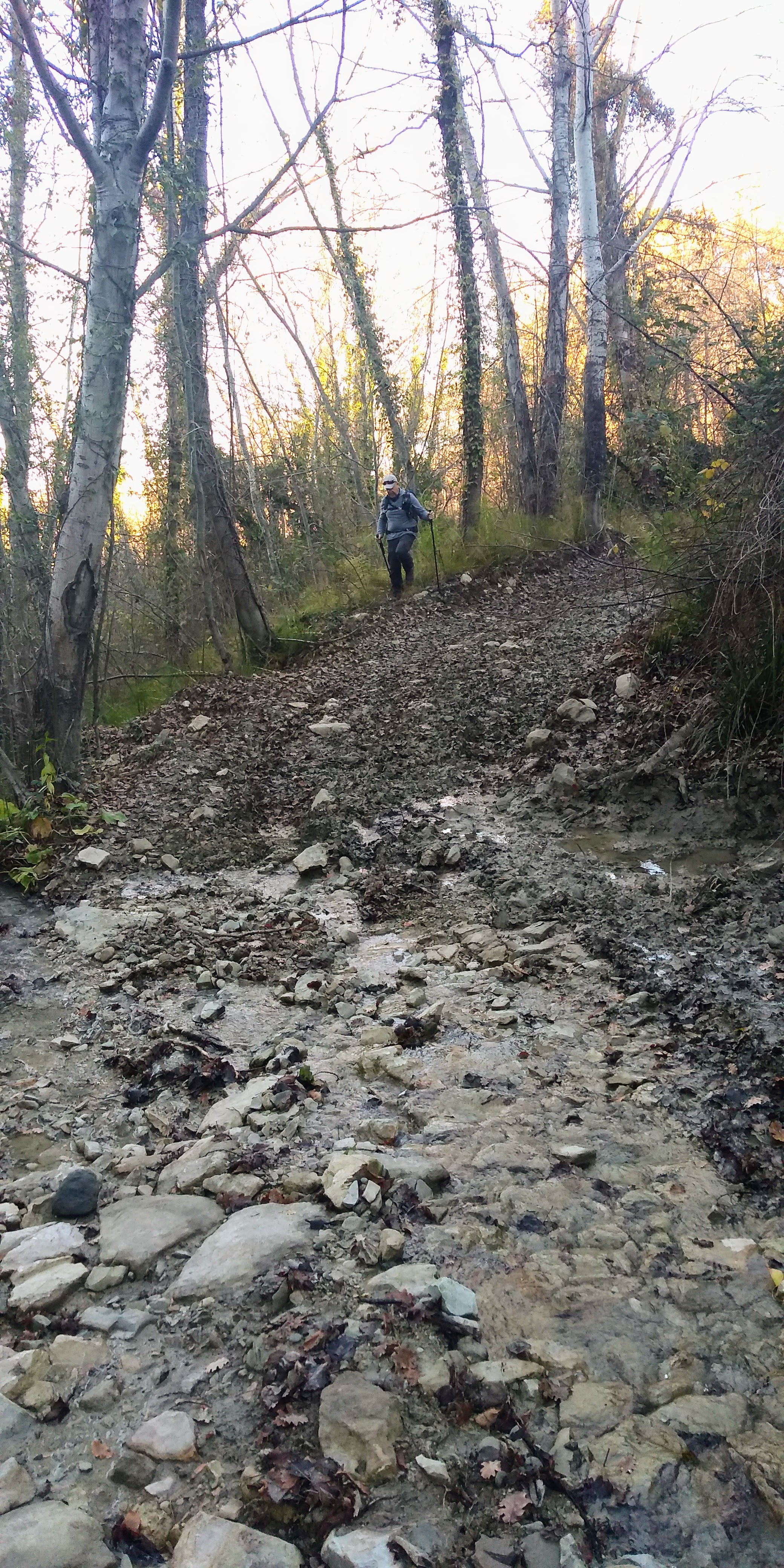 Our hike December 16, sunny winter day. We decided to head to Acquaviva through the woods via Frazione Campo Soci. Most of what we hiked yesterday was very familiar to us, but there was some forest roads that were new as we approached Acquaviva. Definitely not the time to hike forest roads and we are giving up on them until either they are frozen solid or it is warmer, drier weather. The mud was unbelievable! And here in Abruzzo, mud is like glue. It accumulates on the bottom and sides of your boots until you are walking on 5 inches / 12 cm of muck! Also the trail near the river was extremely overgrown, but it got us to our destination. Met lovely folks along the way at the different fraziones we passed through and stopped for some sausage at our friends’ home. We eventually headed home on the hard surface road. 8 miles / 12.8 km with altitude gain of 2023 ft/ 616 mt. As always, beautiful views of the Majella and Montazzoli.