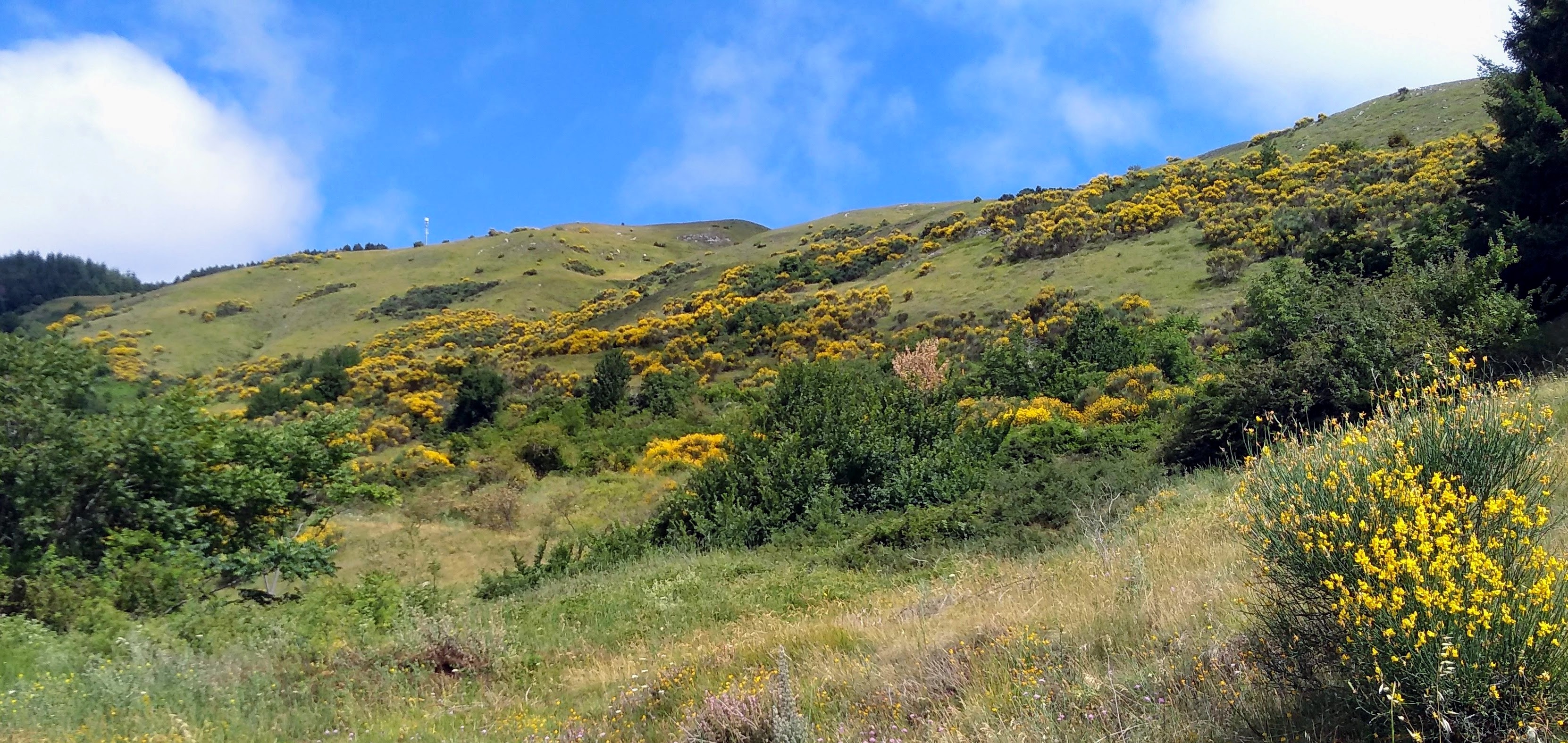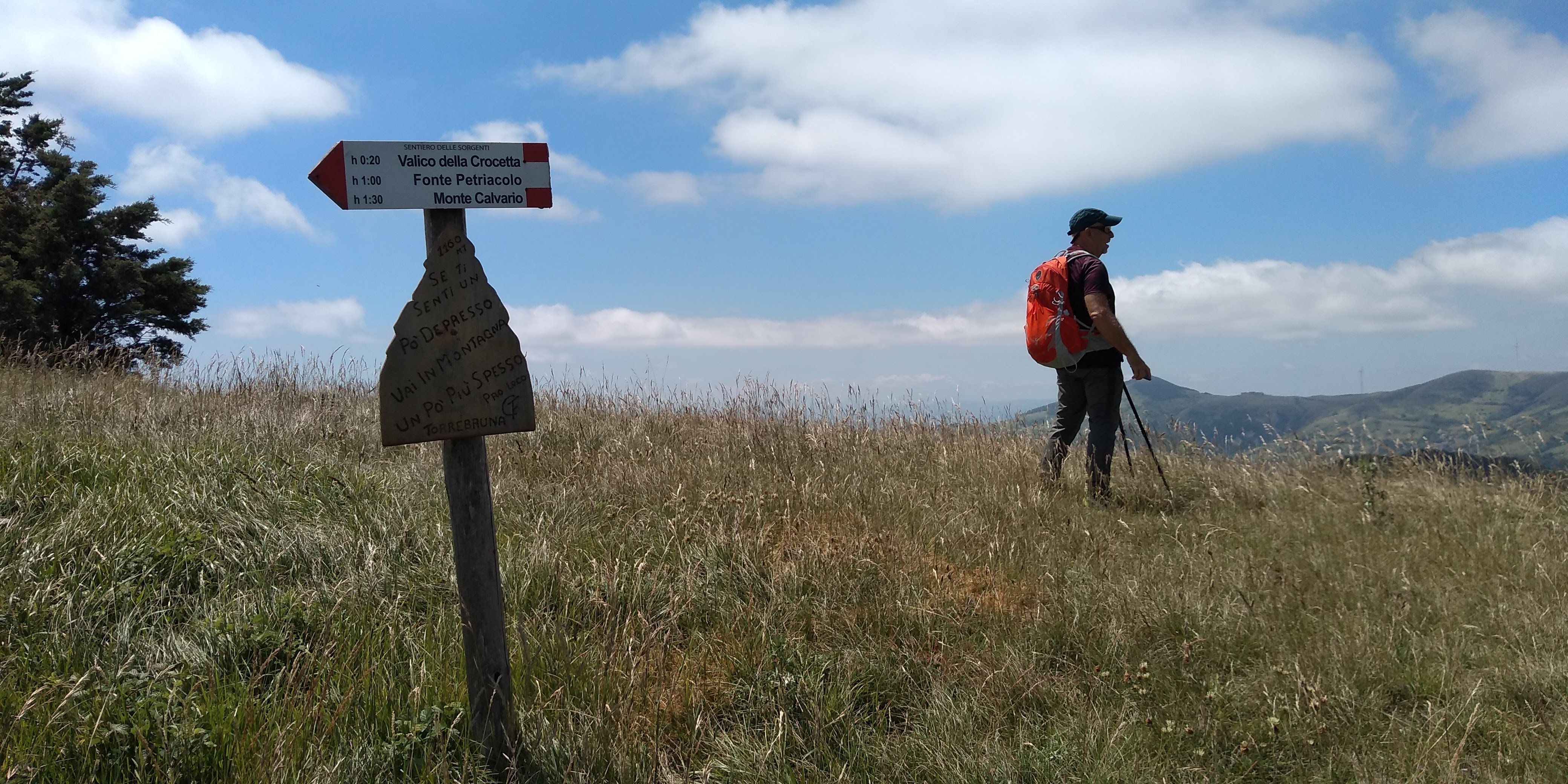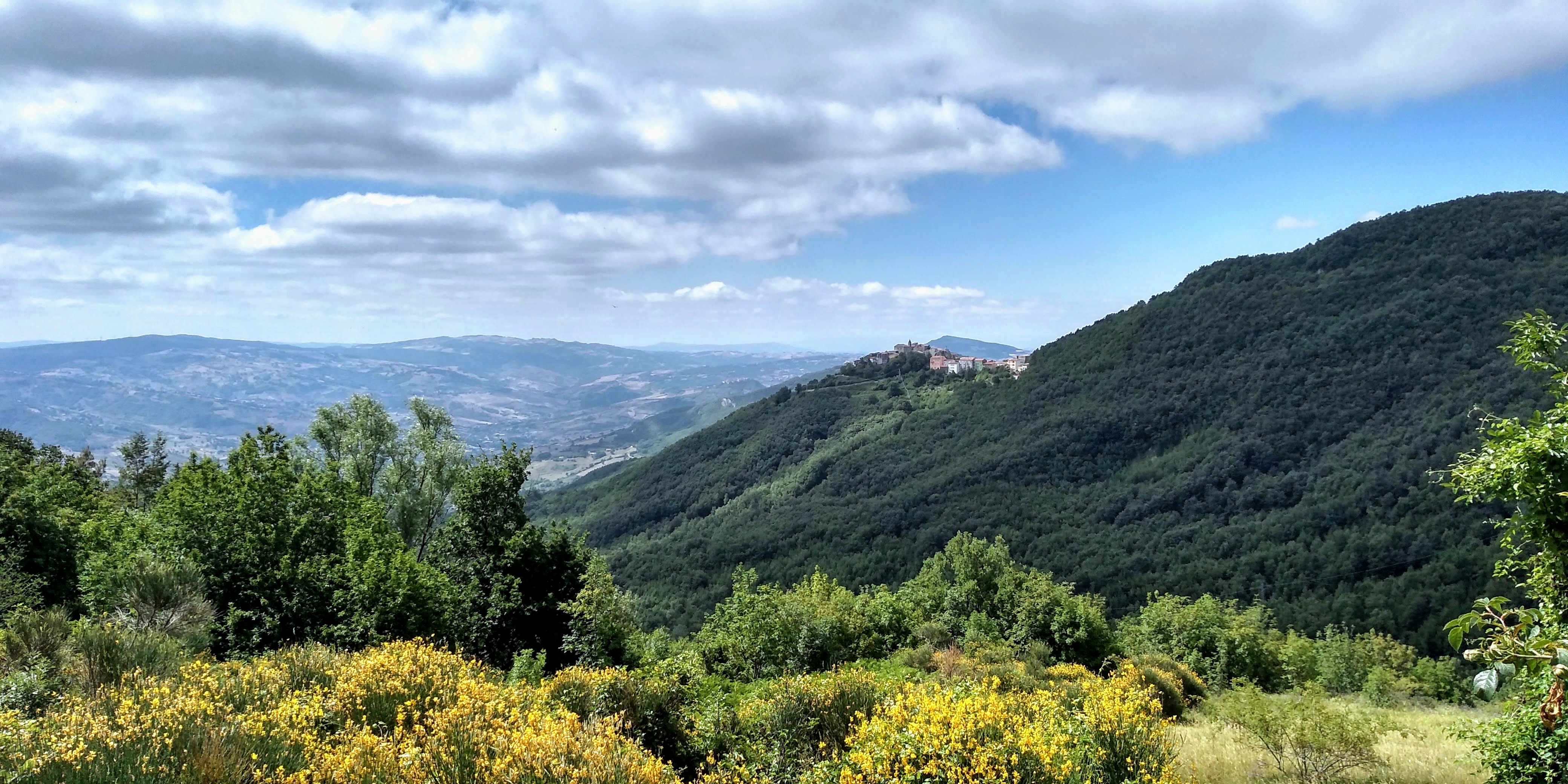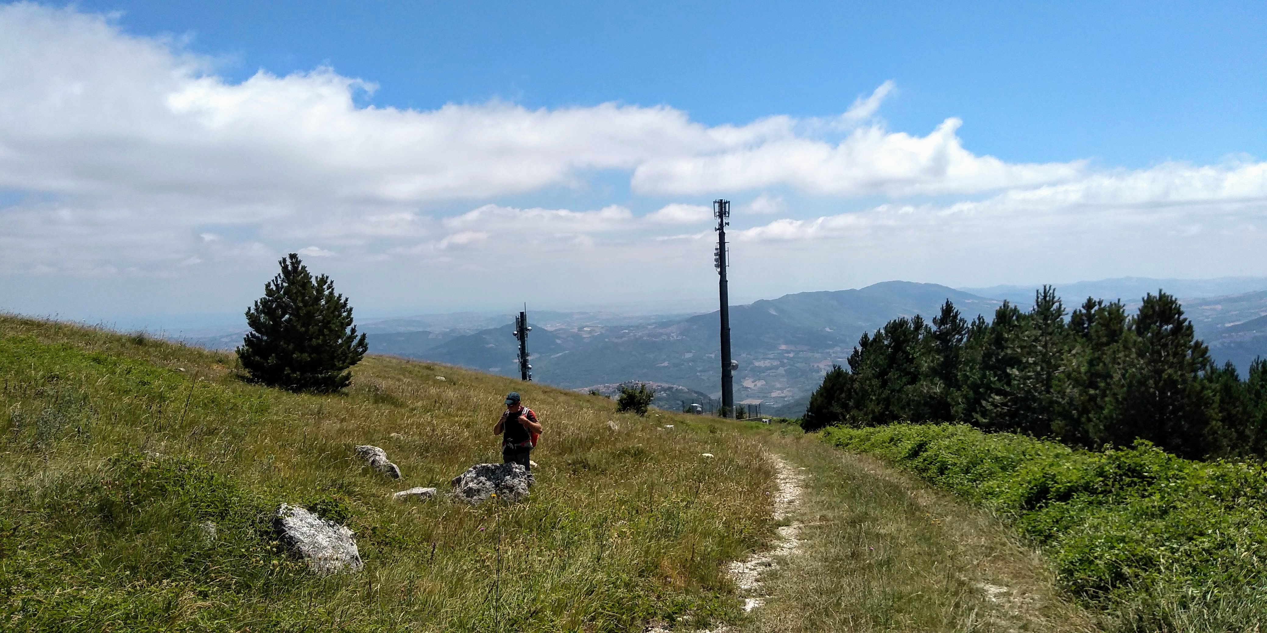 An excellent circuit hike only 30 minutes from our house – Torrebruna! Outstanding long views toward Molise, Gargano Peninsula, Adriatic coastline, north towards Monte Pallano. Medium difficulty, but well marked trail. We went clockwise starting and returning at the Chiesa Madre del Santissimo Salvatore. The only hiccup was finding the trail after Fonte Petriacolo. It wasn’t marked and we lost about 45 minutes hiking up and down the road to figure it out. I circled it in yellow at bottom of map. Once we found it, we headed up through beautiful open fields with amazing views. We walked through lovely forests to the top for 360 views. Heading down we returned through deep shade of evergreens and deciduous trees.. hemlocks, firs, and very large beeches. Numerous fountains along the way to top up your water. We did have a ‘big’ surprise at the end of the trail back into town – a very large sow (boar) crossed our path, luckily to head away from us, but one of her babies got separated and we got a bit worried that the mother would return! Safely back in town we ended our walk back at the church but unfortunately is was closed for the mid-day hours. All in all, just an outstanding hike. Subtracting the 45 minutes of delay at the beginning, approximately 6 miles with elevation gain of 2230 feet.
