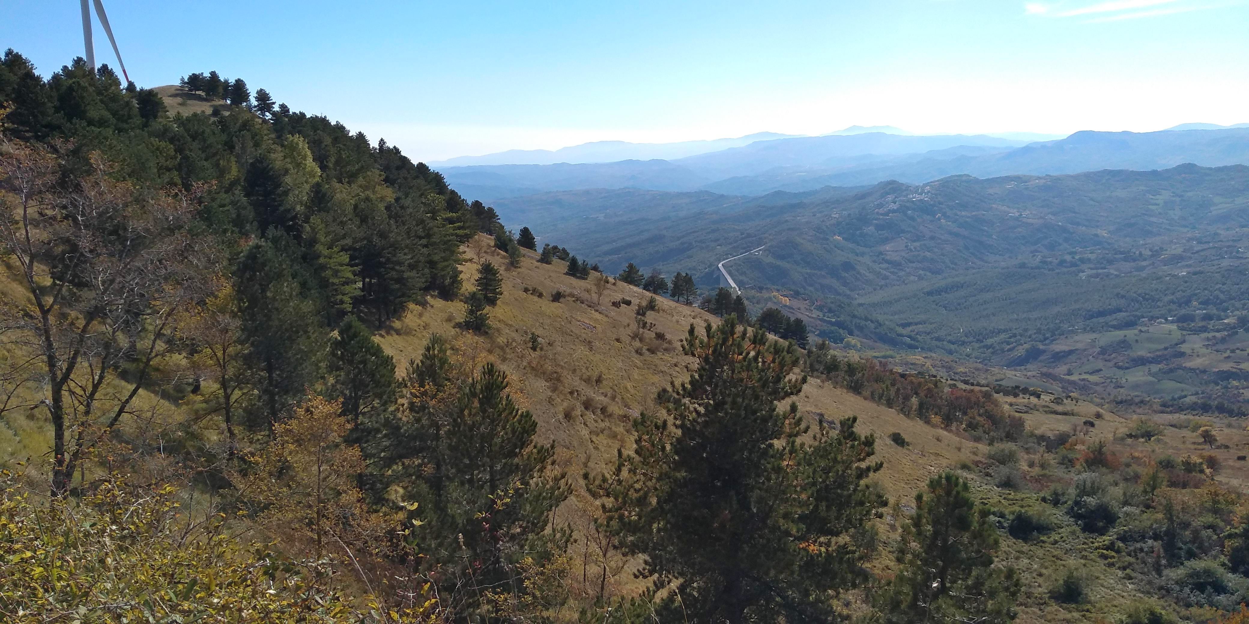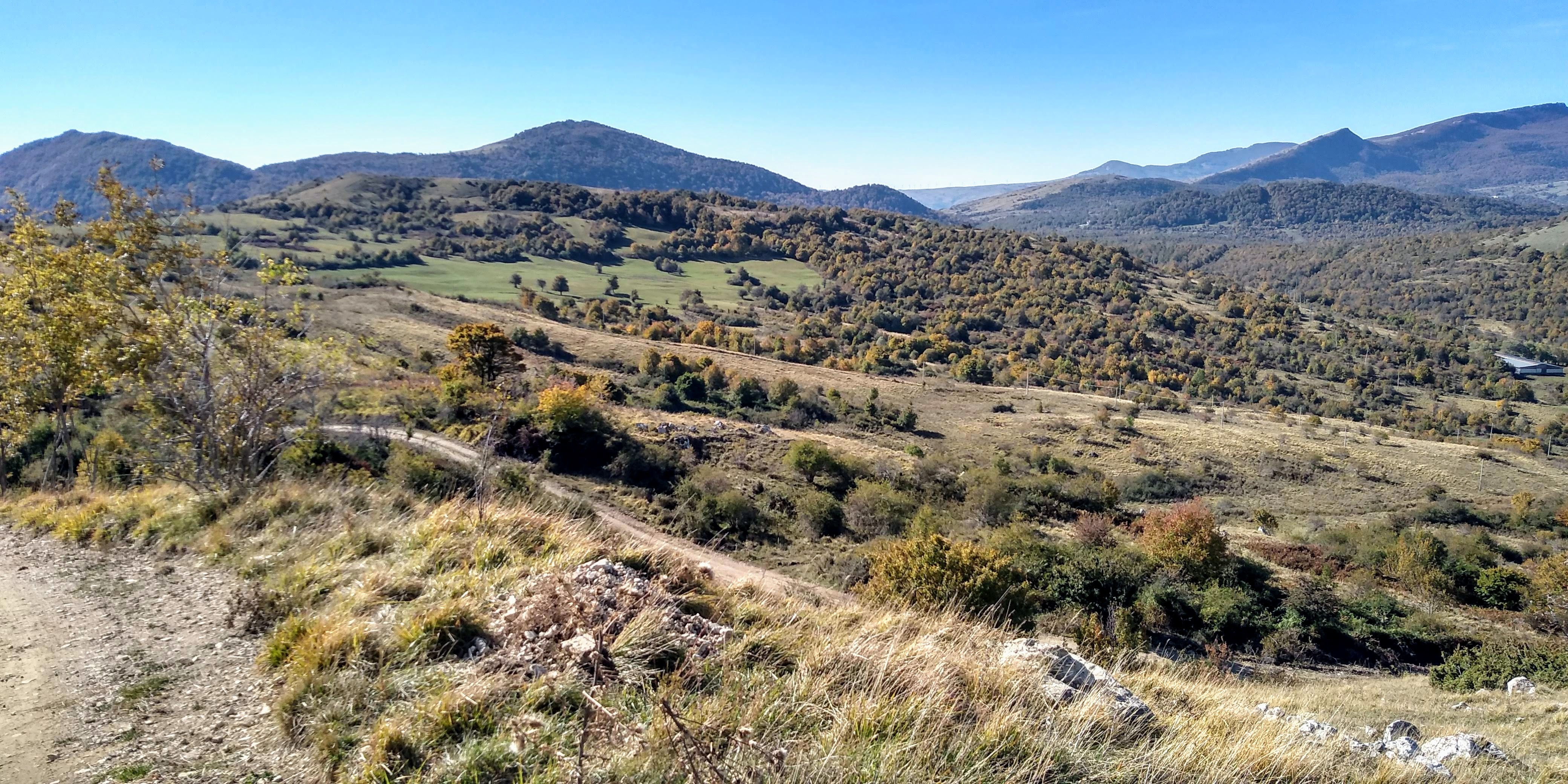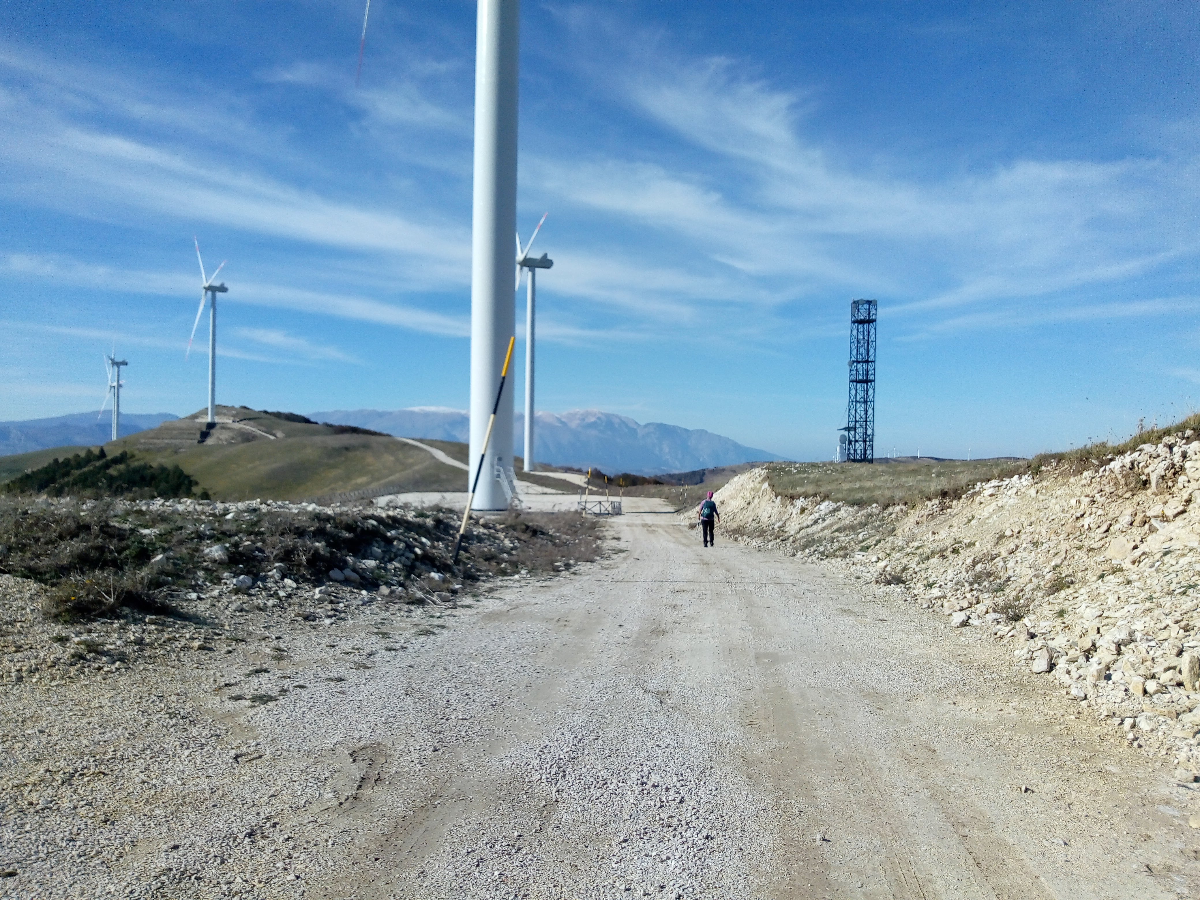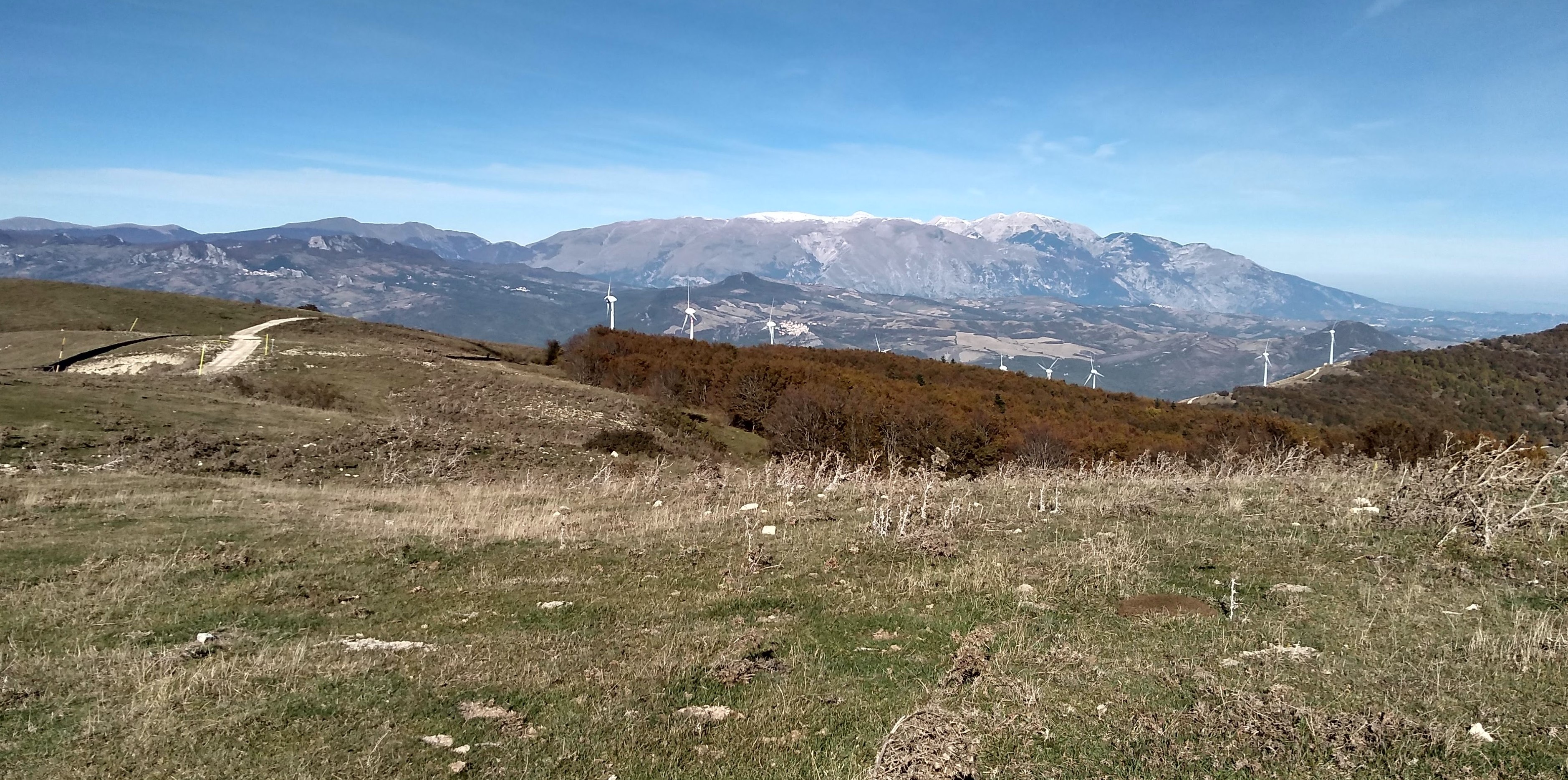 A new hike for us ( 40 minutes from our house)and what a beautiful surprise. Long vistas toward sea, Molise, the Majella, green valleys with leaves changing colors for Fall. We started up at the wind farm, down to the valley and then finished back where we started. I missed a turn, missing Lago La Croce up close, (see maps), but corrected toward the climb back up to mountain. We did get a view of the lake up from up high. We will return to do this hike middle of November, when colors more intense. Care to join us? 14km/8.7 miles, elevation change 605 m/ 2132 ft, elevation 1379 m/ 4524 ft ![]()