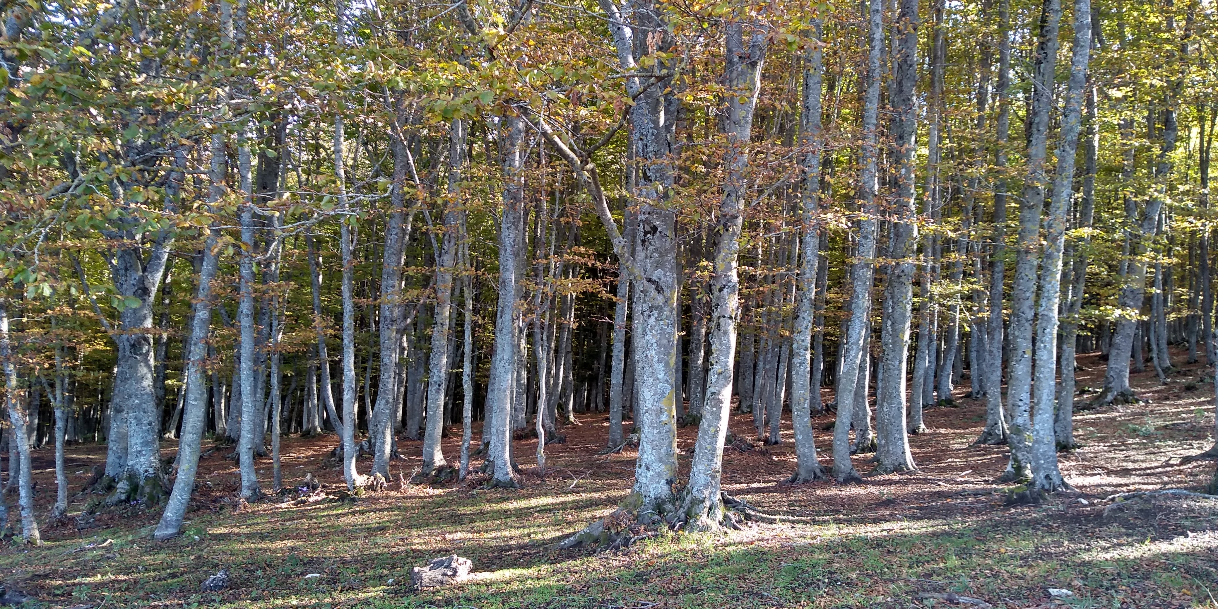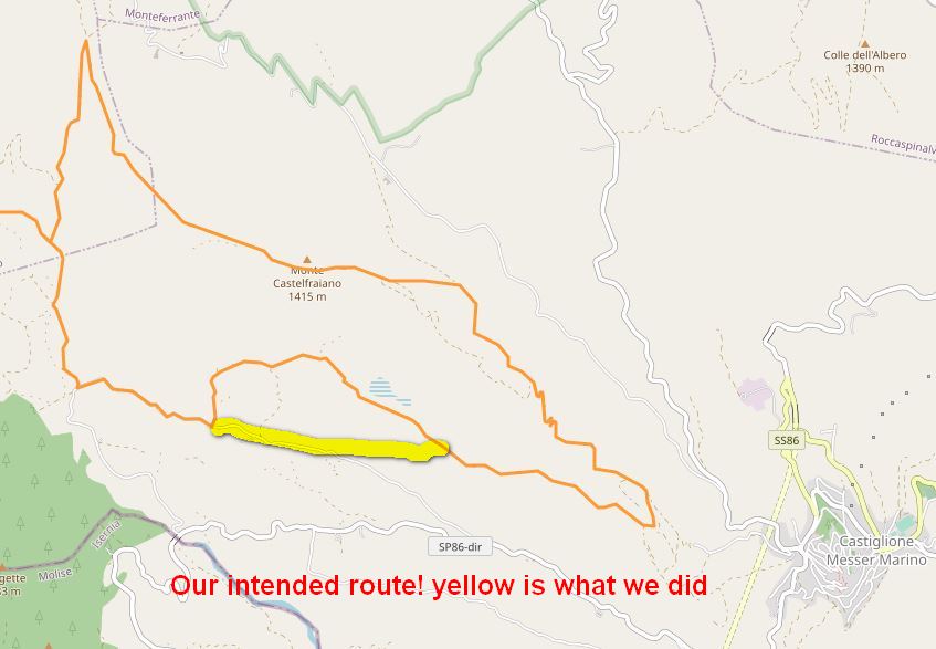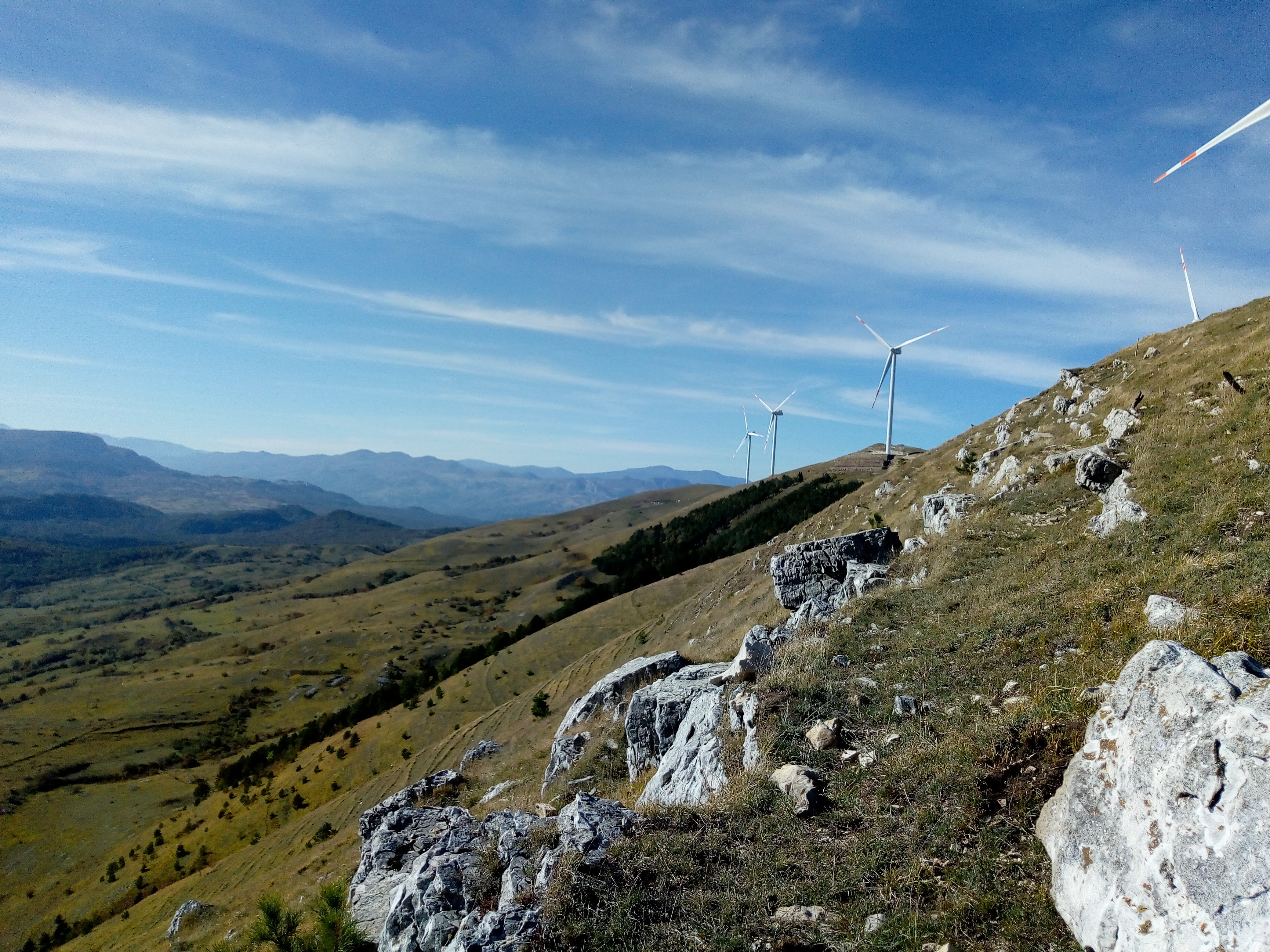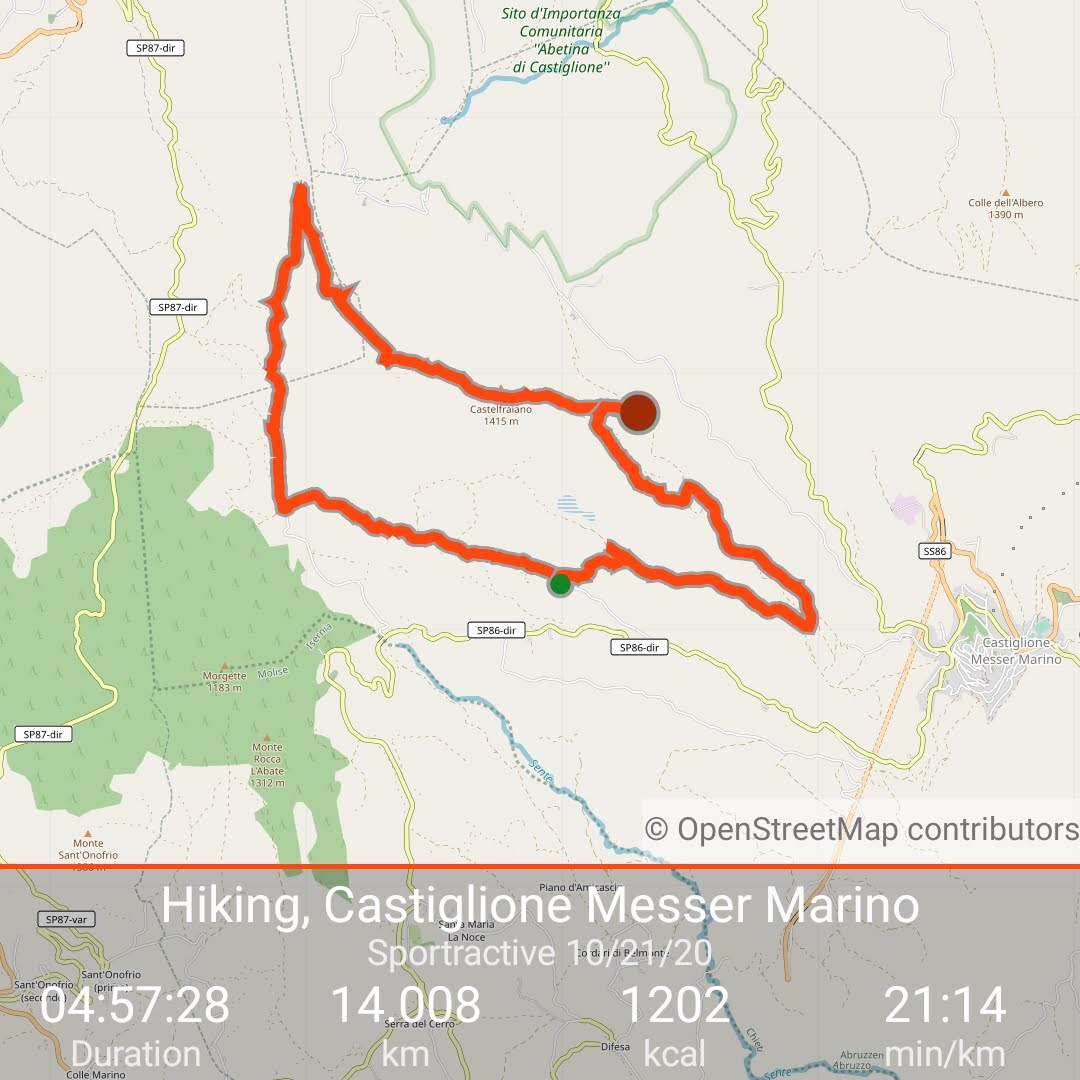 A new hike for us ( 40 minutes from our house)and what a beautiful surprise. Long vistas toward sea, Molise, the Majella, green valleys with leaves changing colors for Fall. We started up at the wind farm, down to the valley and then finished back where we started. I missed a turn, missing Lago La Croce up close, (see maps), but corrected toward the climb back up to mountain. We did get a view of the lake up from up high. We will return to do this hike middle of November, when colors more intense. Care to join us? 14km/8.7 miles, elevation change 605 m/ 2132 ft, elevation 1379 m/ 4524 ft ![]()